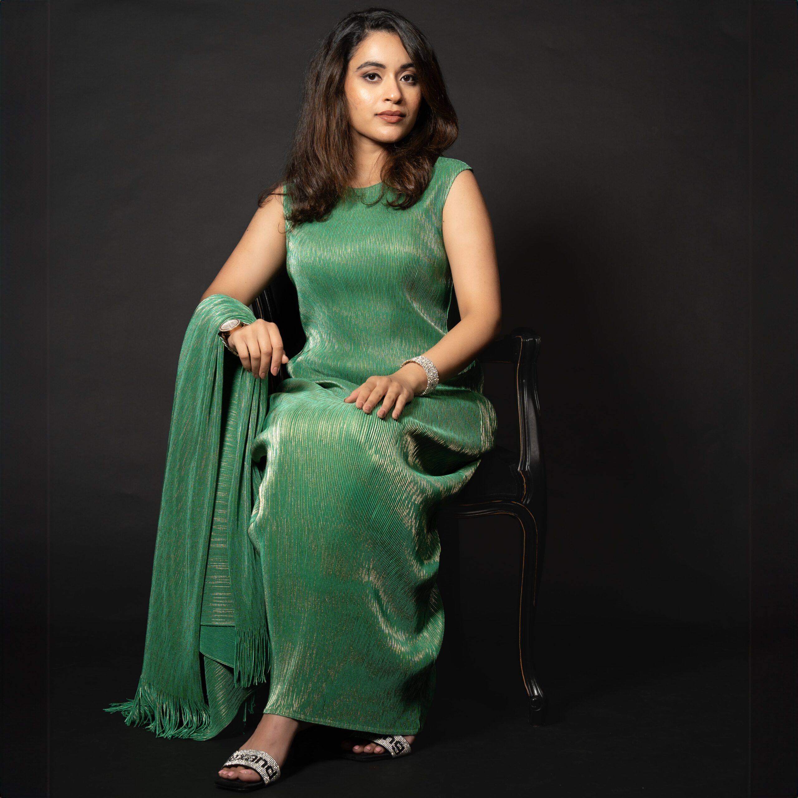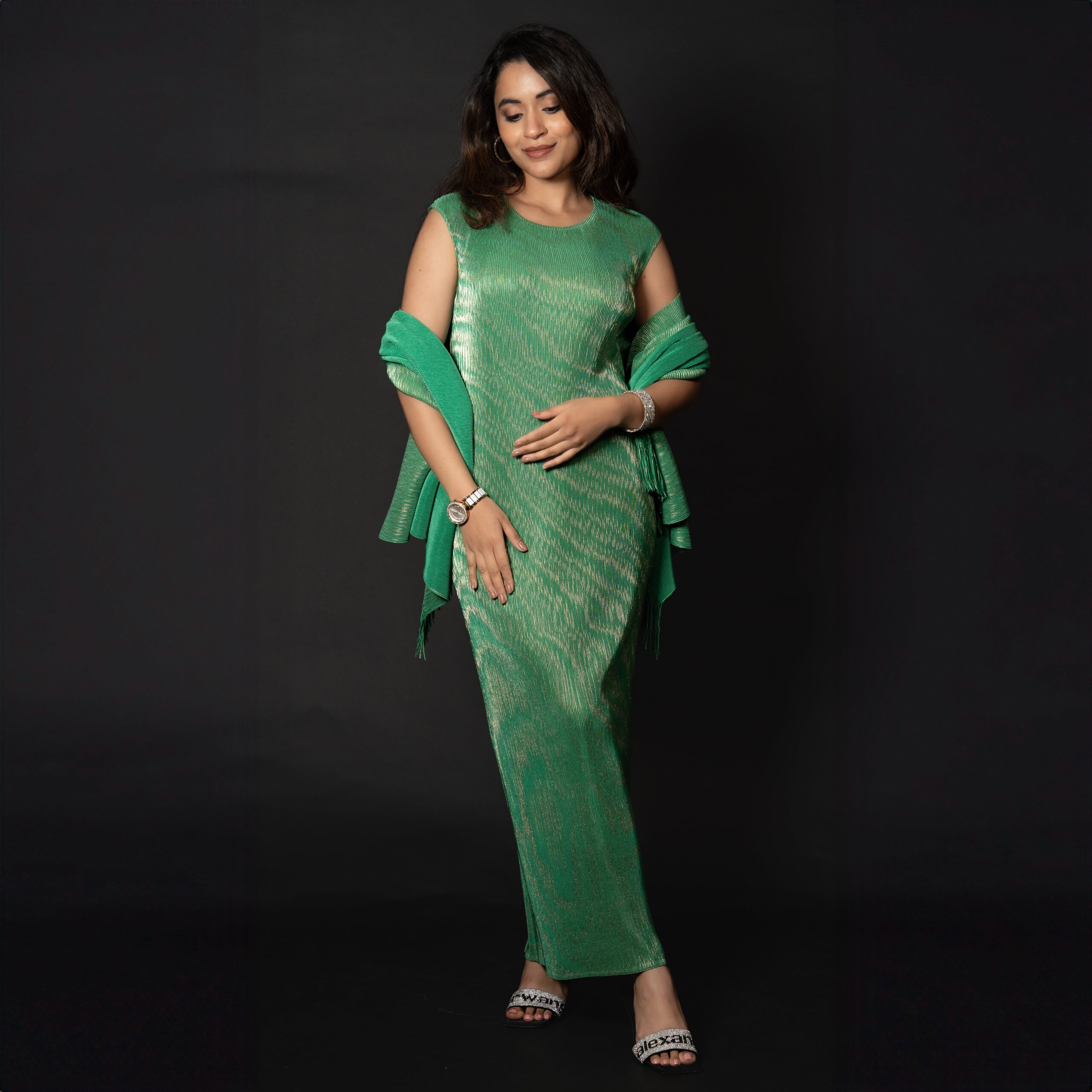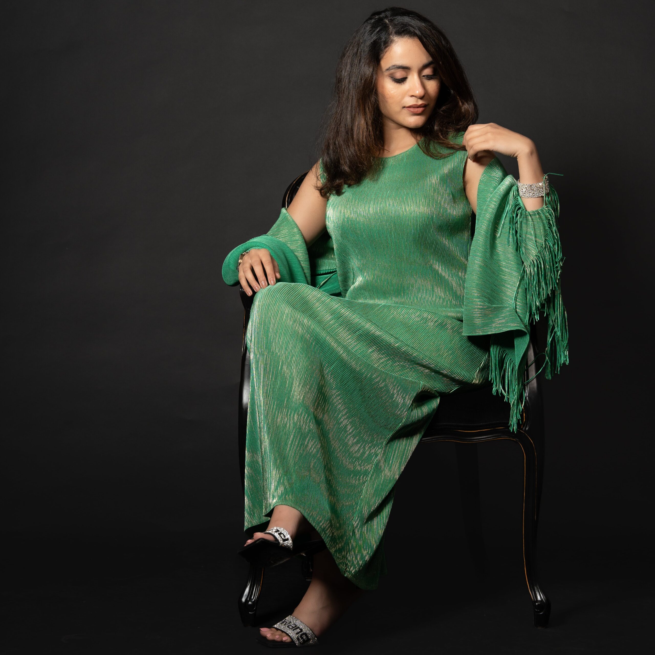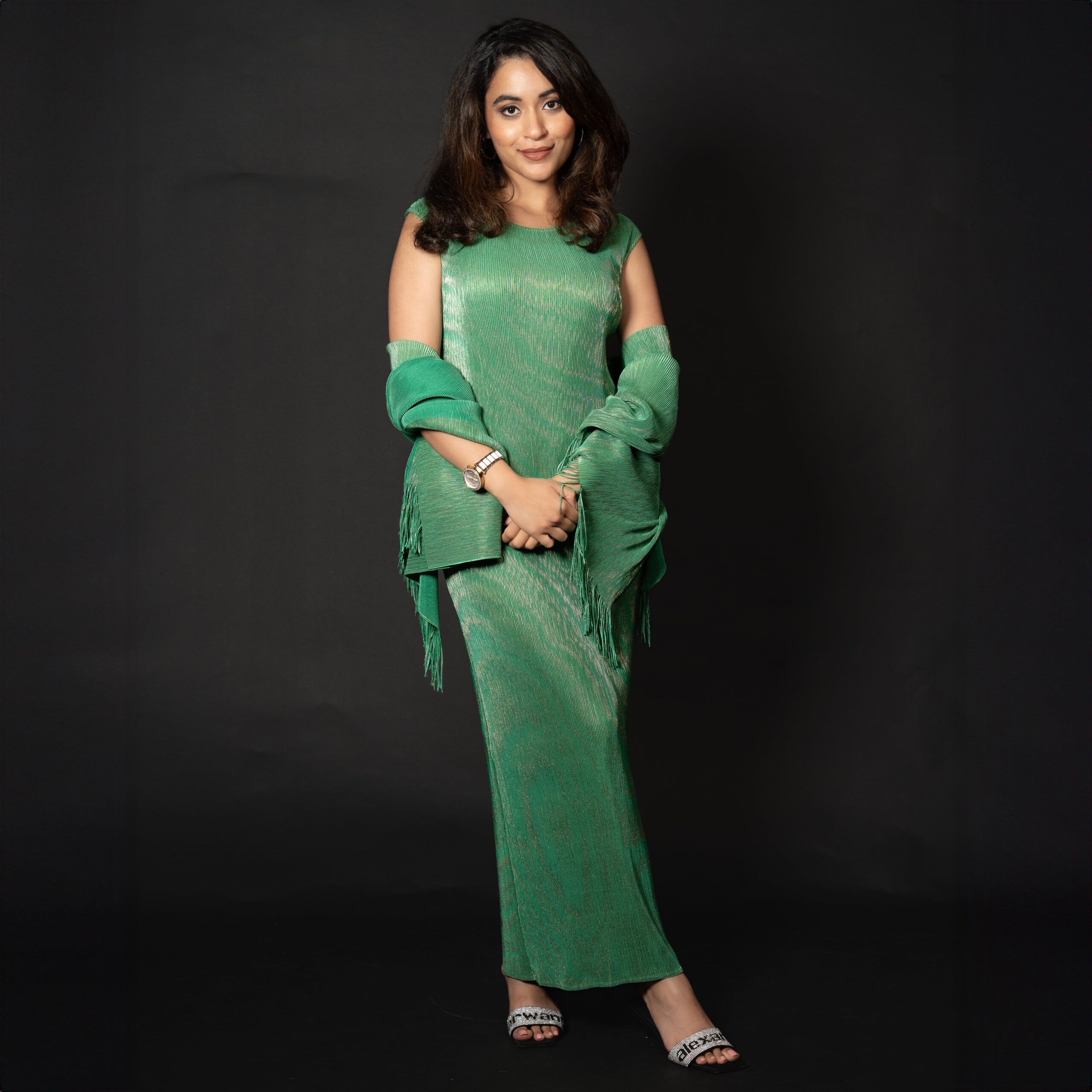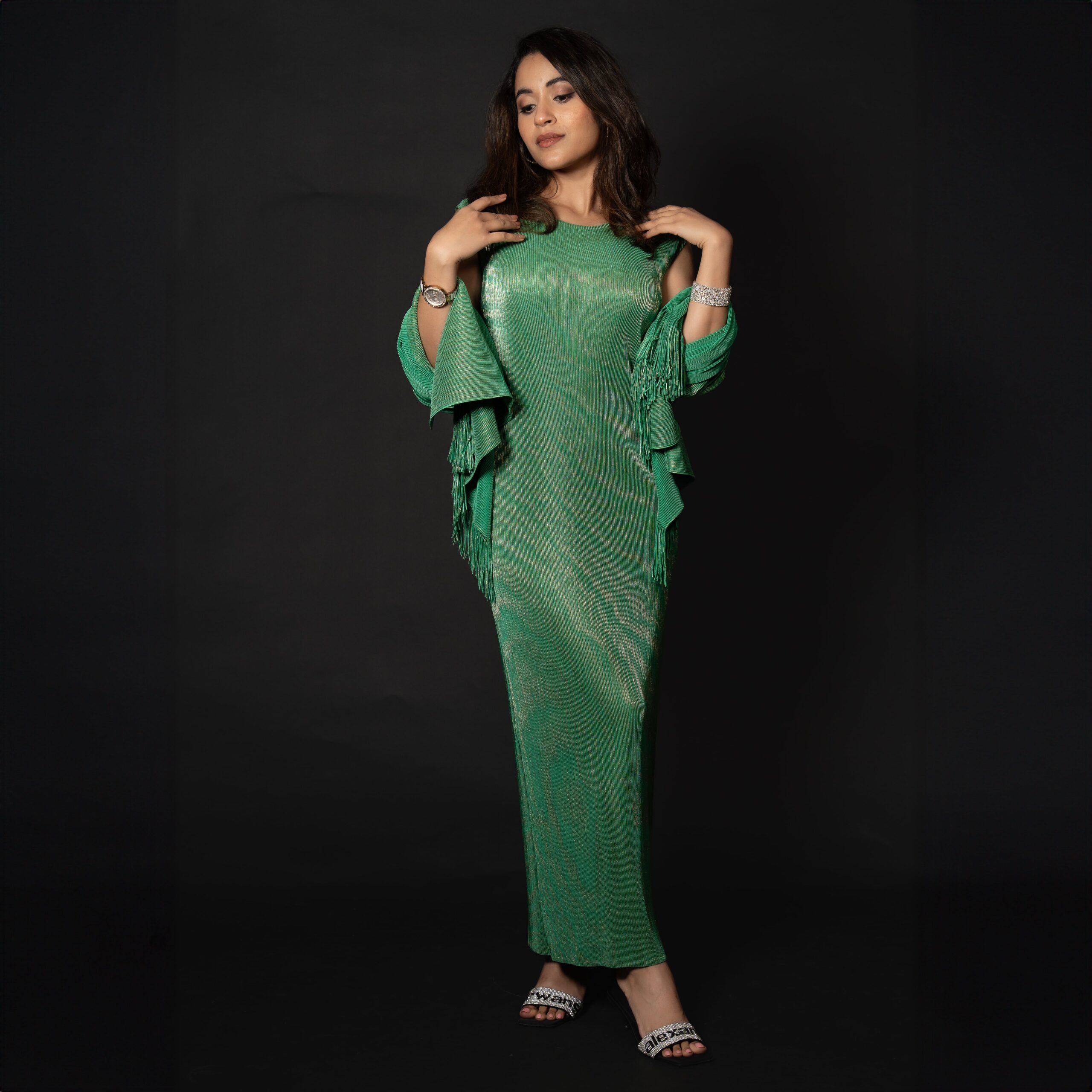 A stunning long dress paired with a beautifully detailed shawl adorned with tassels. Exudes regal elegance with its golden detailing and available in pink and green. Made from recycled polyester.