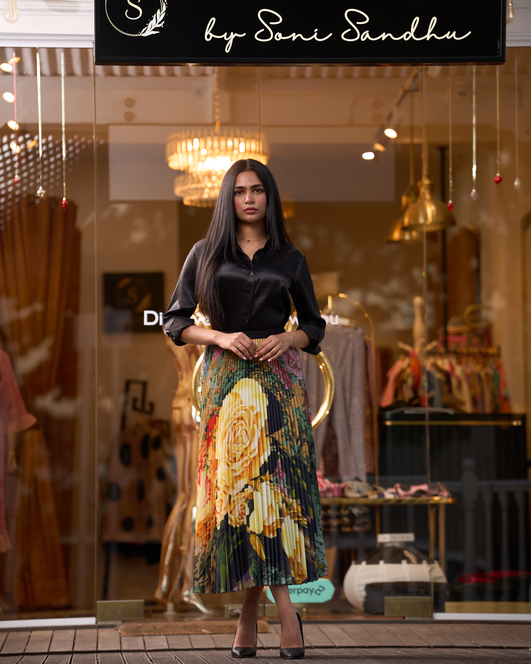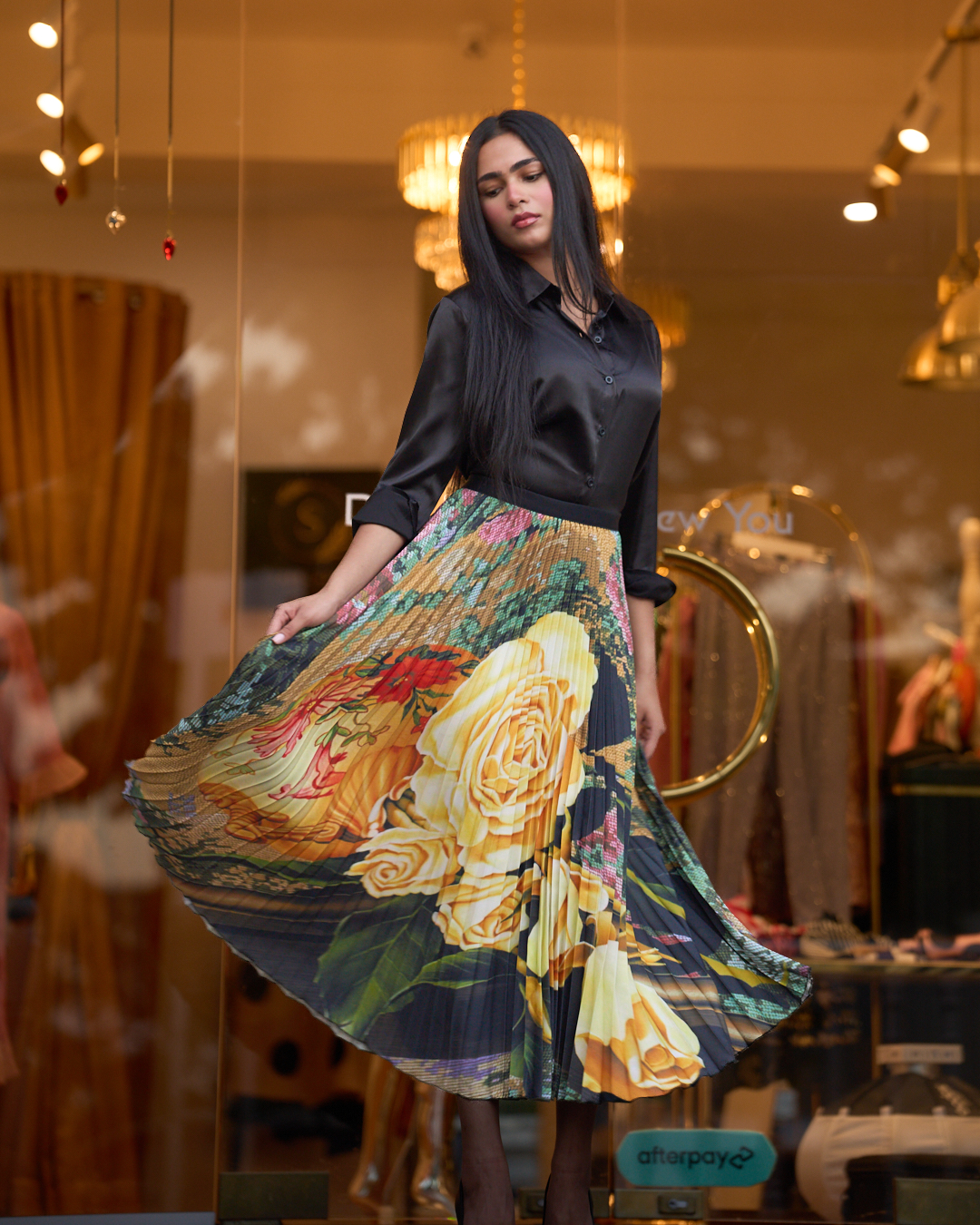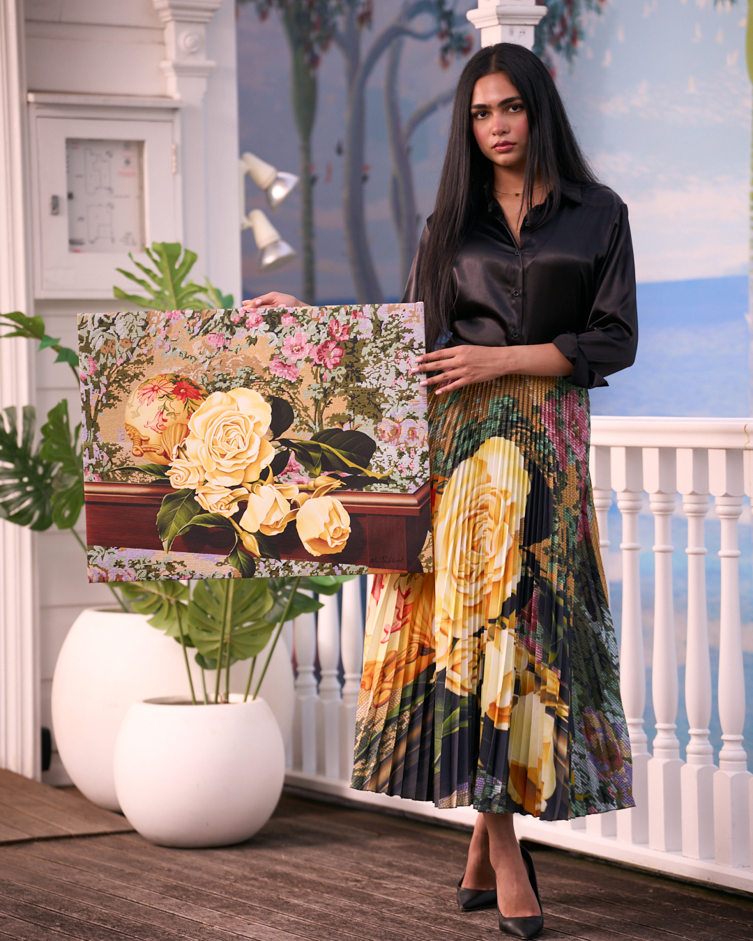 A true expression of wearable art, the Alvin Rose Majesty Artwork Skirt captures blooming roses in rich detail, translated into a fluid pleated silhouette that moves beautifully.