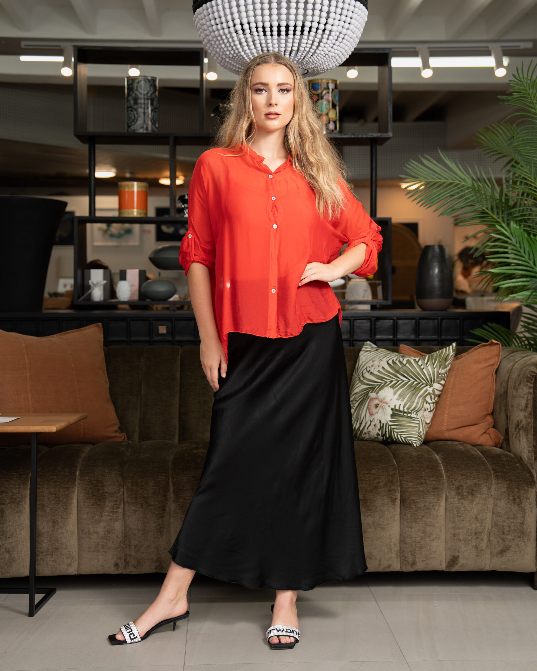The Black Silk Skirt features a sleek, smooth design in neutral tones that is perfect for any occasion. The elastic waist ensures a comfortable and flexible fit, while the flowy, A-line silhouette adds a touch of elegance to your look. Ideal for pairing with tops and blouses for both professional and casual wear.