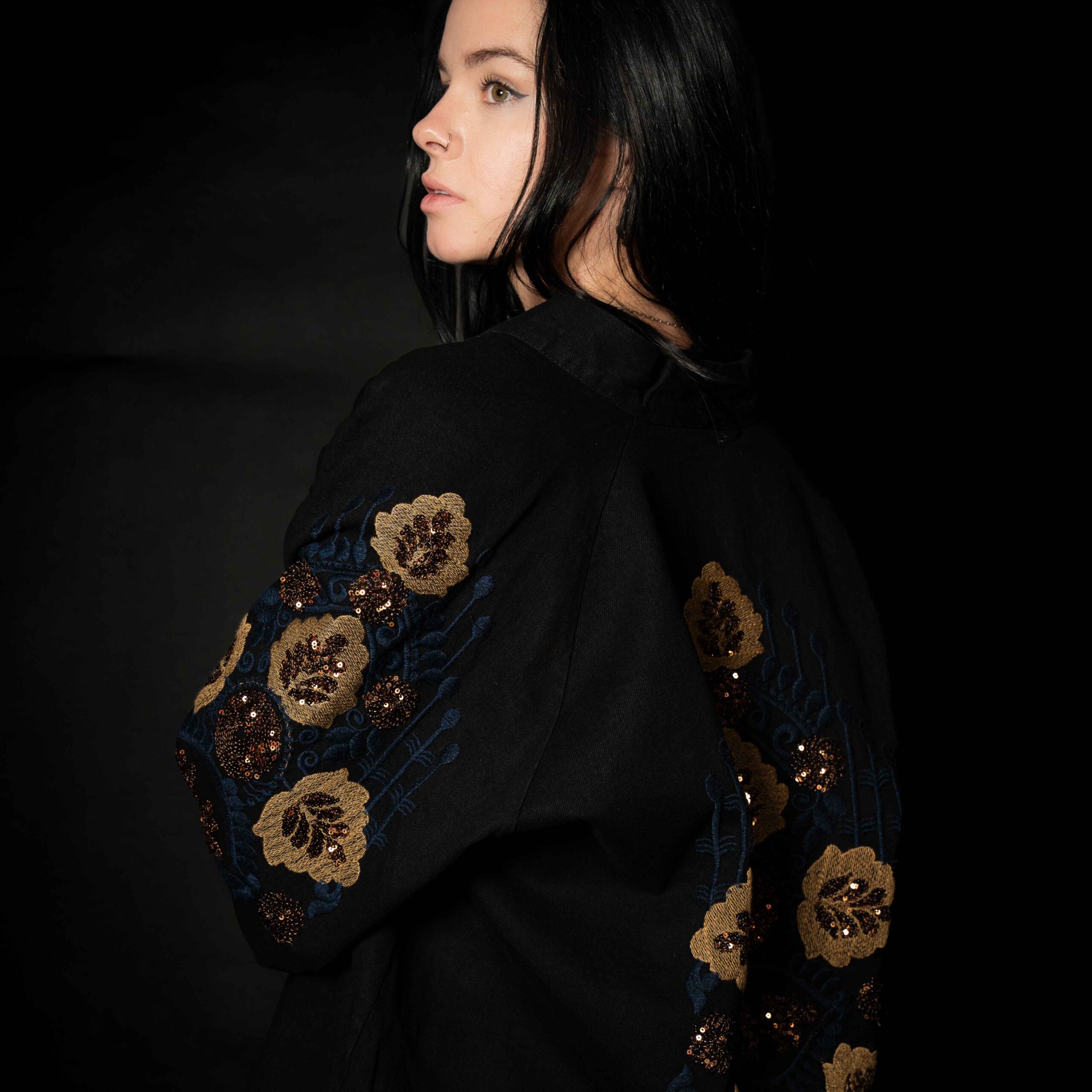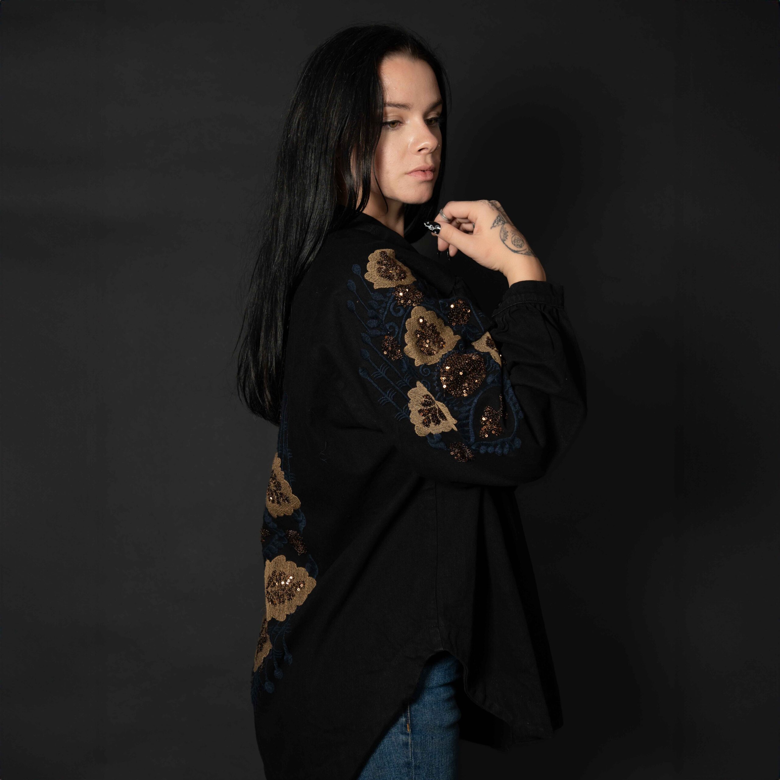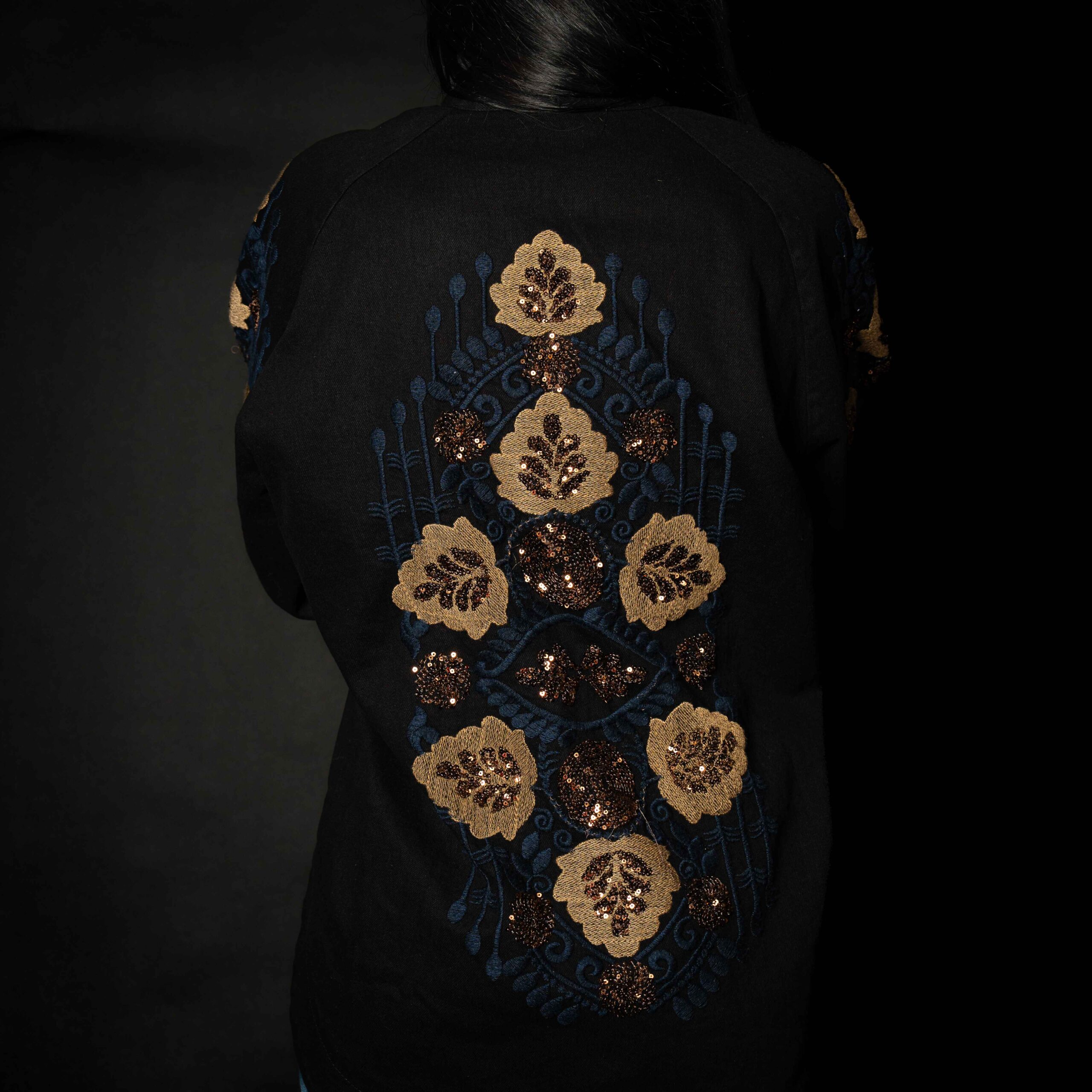 A stylish jacket with full embroidery on the sleeves and the back. Ideal for layering over any outfit, perfect for the winter season.