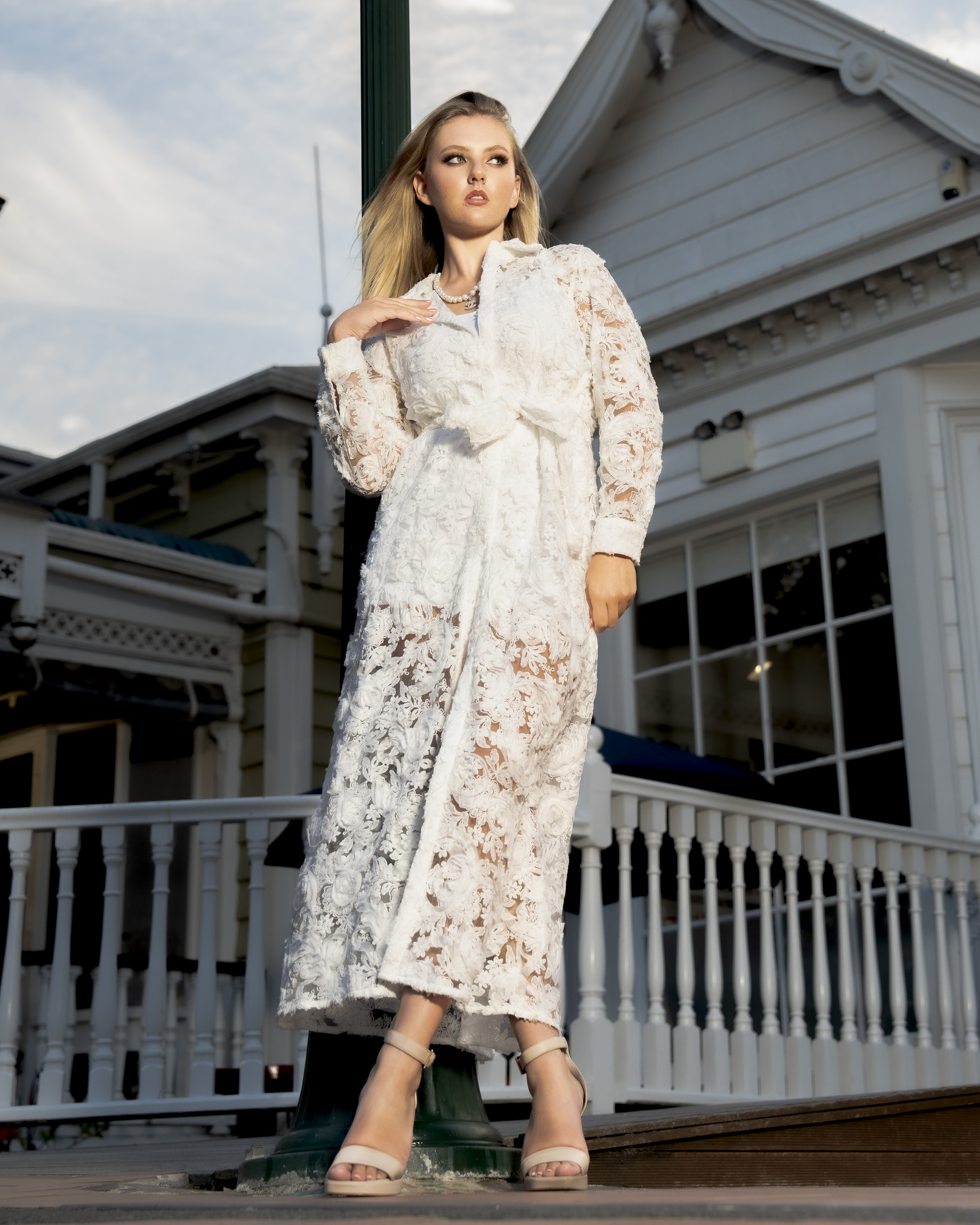 This sophisticated full-length lace dress features a collared neckline, long sleeves, and a tie waist that creates a flattering, fitted look. The button-down front adds a classic touch to the contemporary lace detailing, making it a perfect choice for both formal and semi-formal events. Crafted from 100% polyester, this dress combines timeless elegance with modern style. Its sheer lace finish and sophisticated silhouette make it a true statement piece. Whether worn to a gala, wedding, or elegant evening event, the Elara Lace Long Dress is bound to impress.