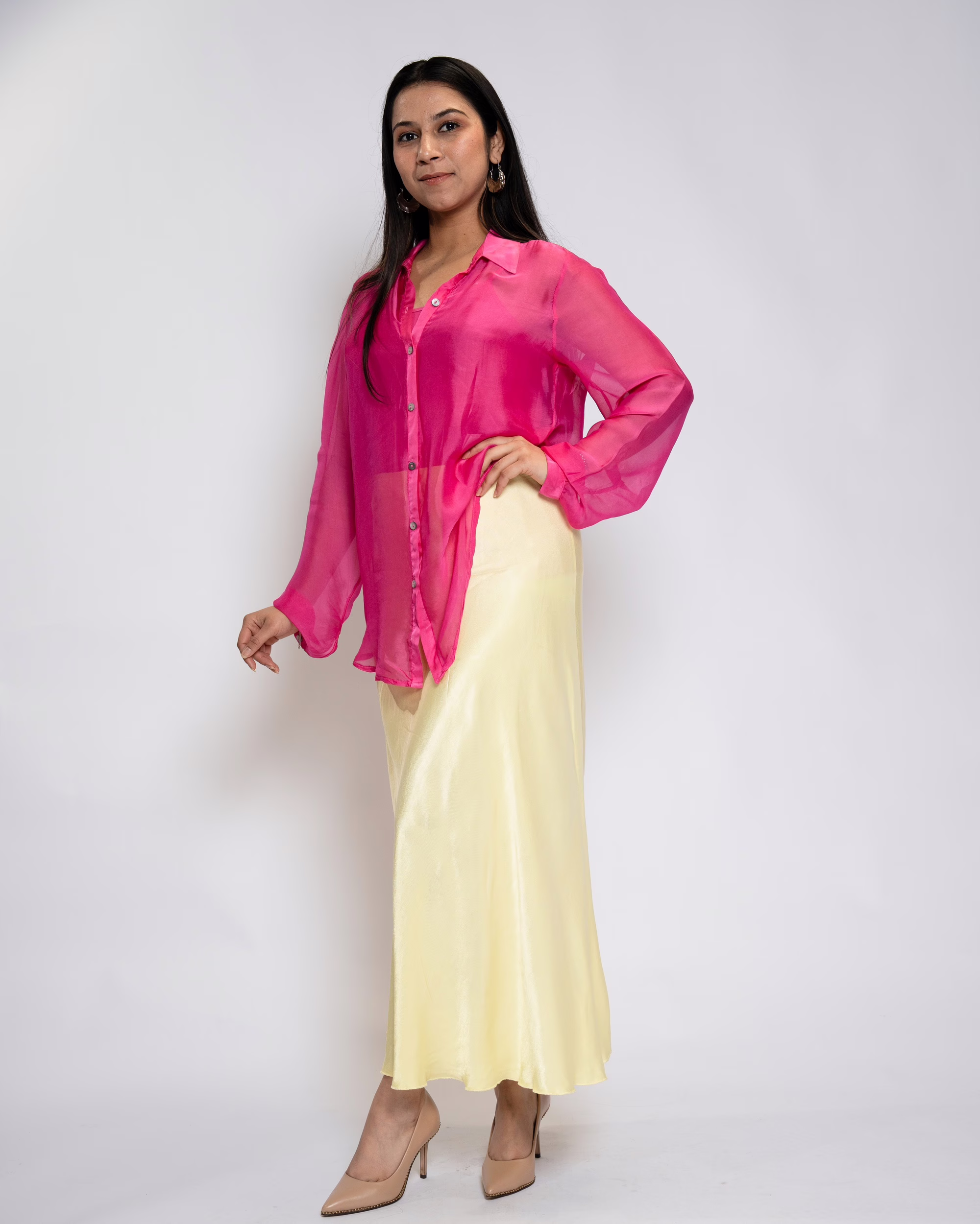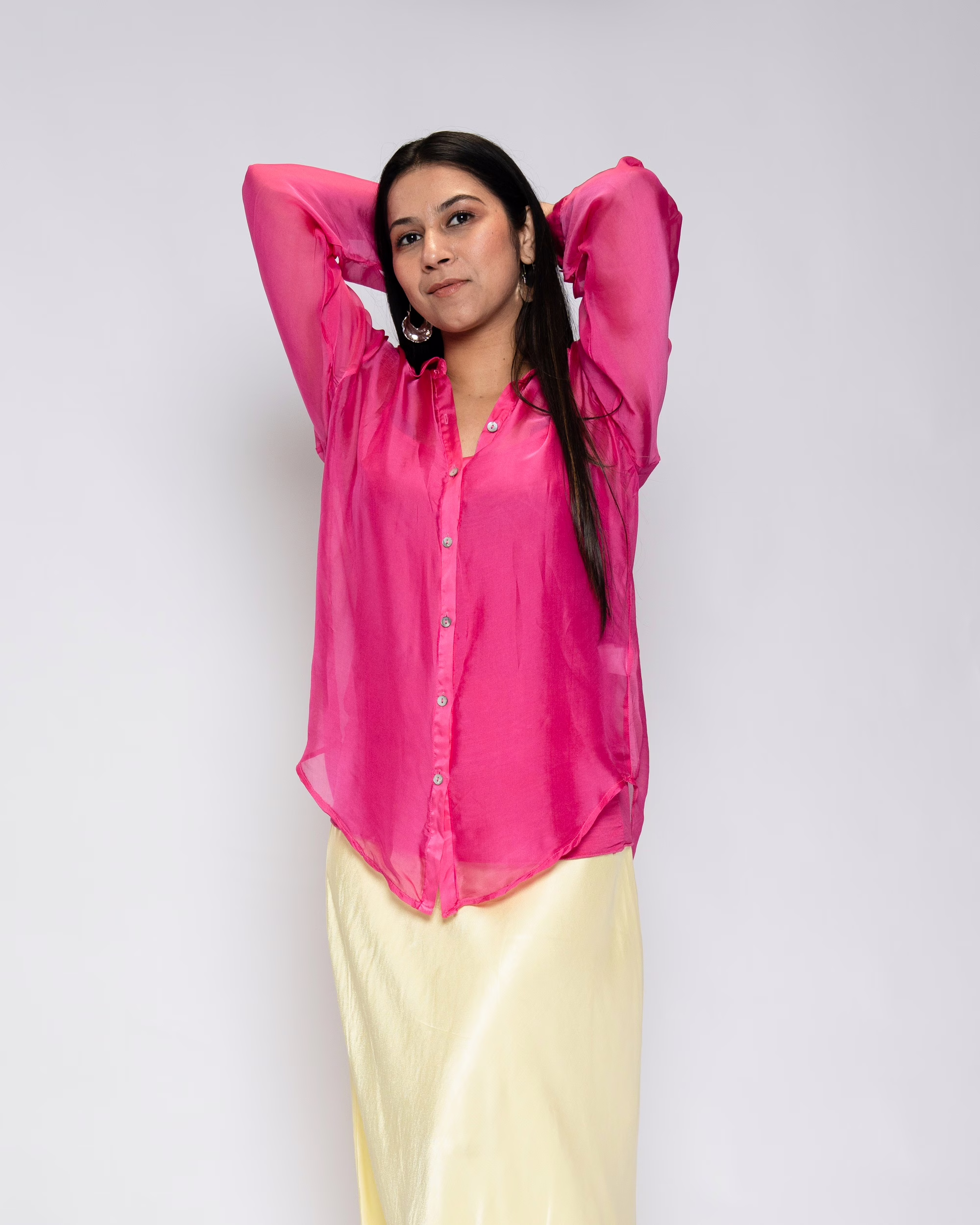 A vibrant fuchsia chiffon silk shirt with a lightweight, flowing silhouette. Comes with a matching inner camisole for easy styling. The sheer, airy fabric drapes gracefully, offering comfort and elegance—perfect for layering or wearing as a standout piece from day to evening.