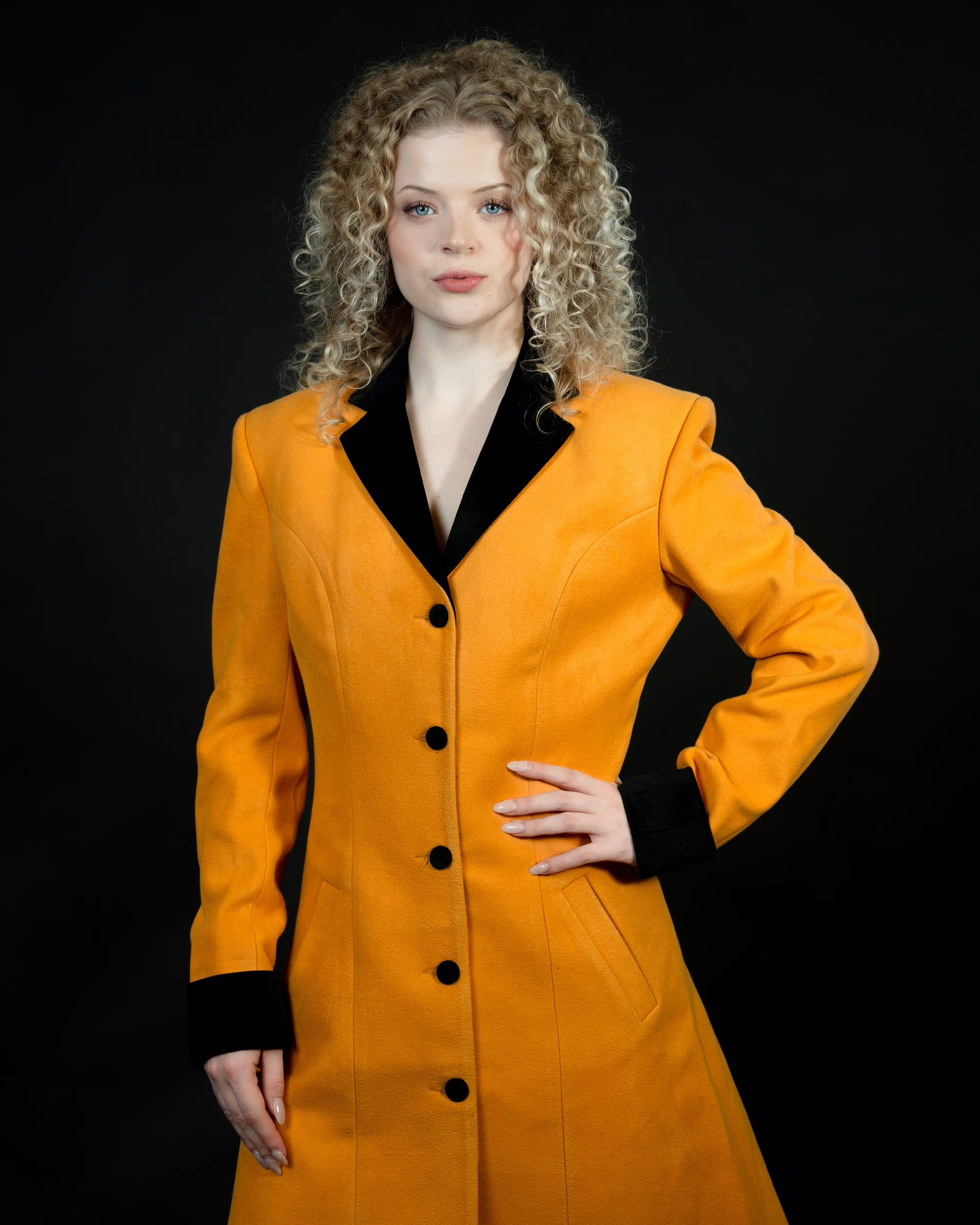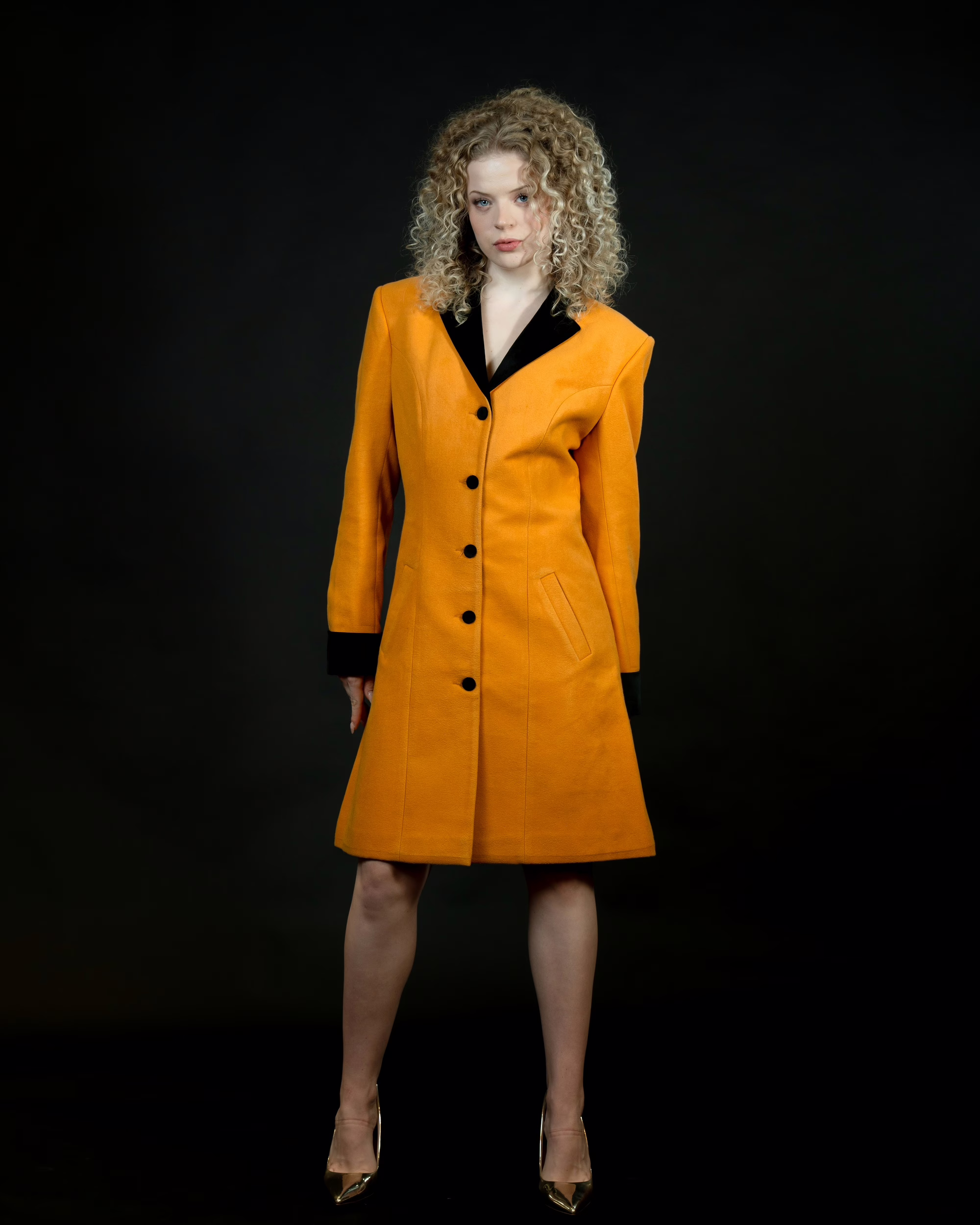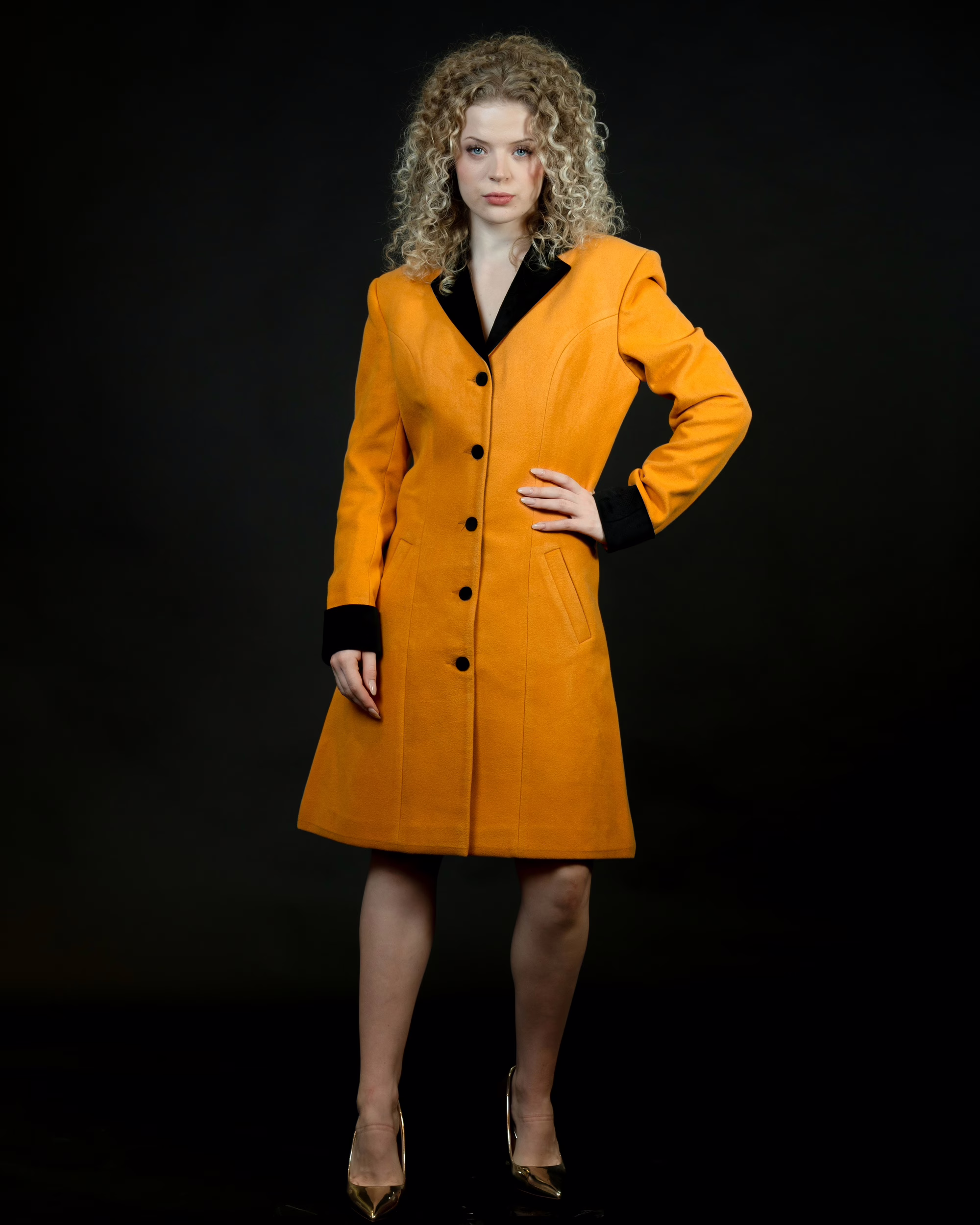 Radiate elegance in the Golden Hour Coat, a soft golden-beige overcoat that’s both structured and warm. With sharp tailoring, subtle gold buttons, and feminine curves, it brings glow to winter days. Designed to layer seamlessly over seasonal outfits, it balances structure with warmth, making it an essential in any winter wardrobe.