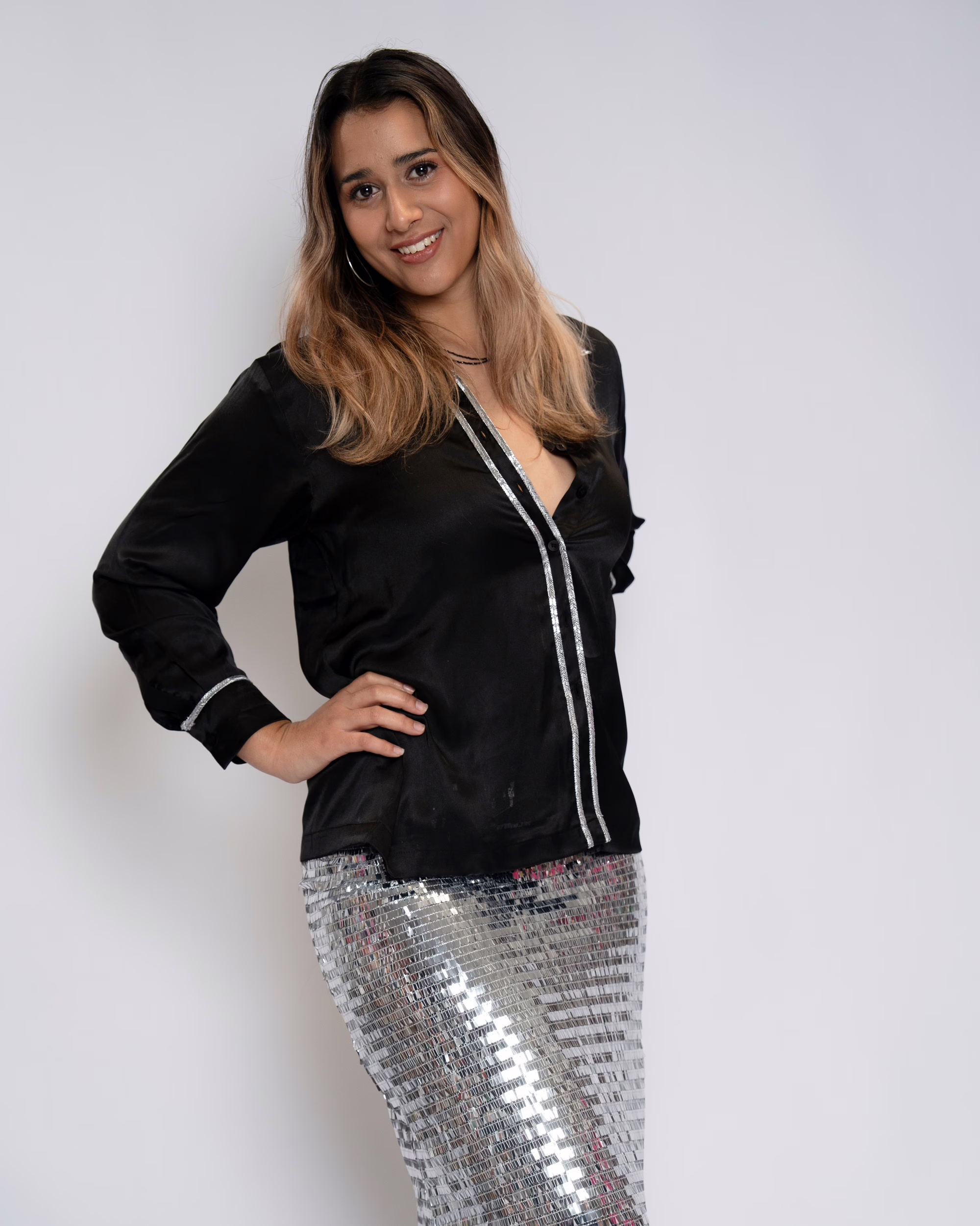 A timeless black satin shirt with a soft, fluid drape and a subtle lustrous finish. Tailored with a classic collar, button-down front, and delicate contrast piping along the edges, it elevates any outfit from casual chic to evening glamour. Lightweight and silky against the skin, it layers beautifully over camisoles or pairs effortlessly with everything from tailored trousers to statement skirts for a look that transitions seamlessly from day to night.