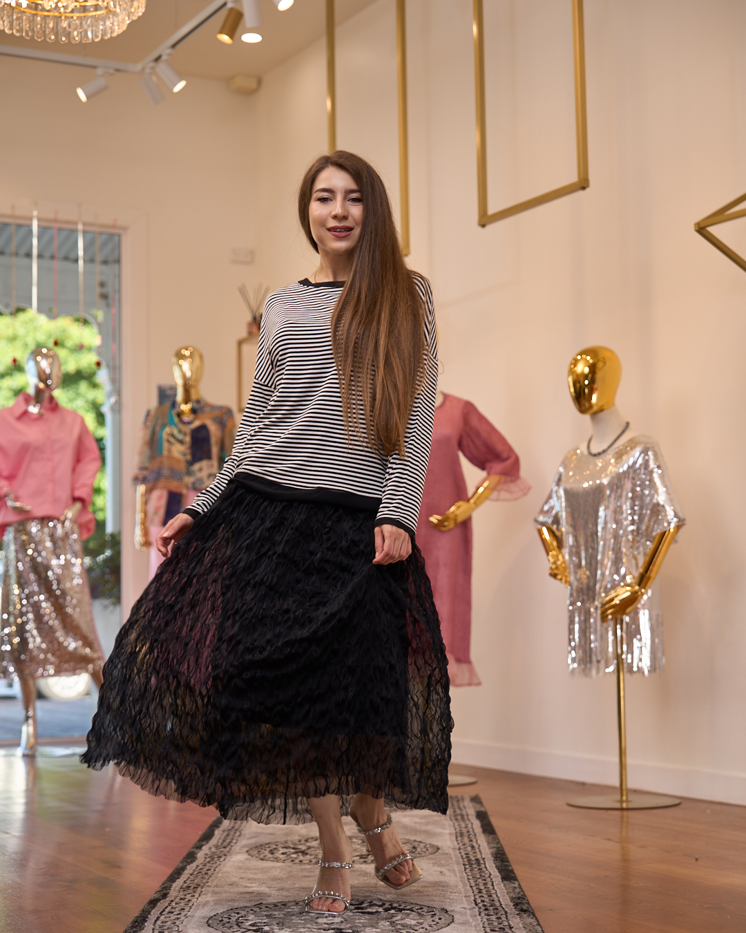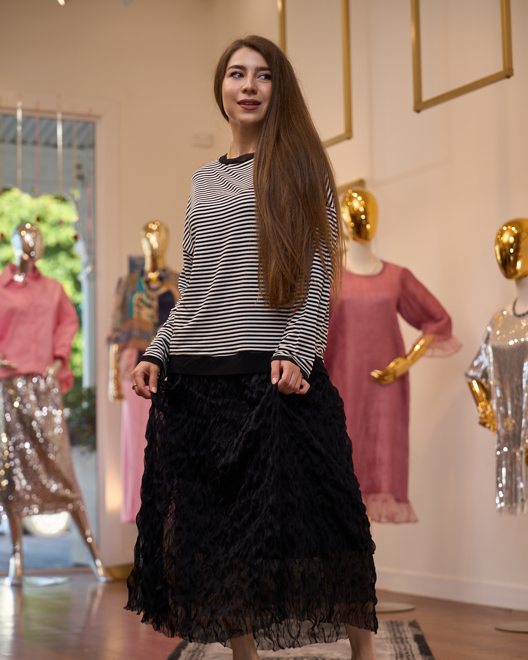 Elevated with texture and movement, the Noir Textured Skirt brings a soft statement to contemporary dressing. Designed with a flowing silhouette and intricate wrinkled detailing, it creates depth and fluidity with every step. A refined black piece that balances drama with elegance, perfect for both day-to-evening transitions.
