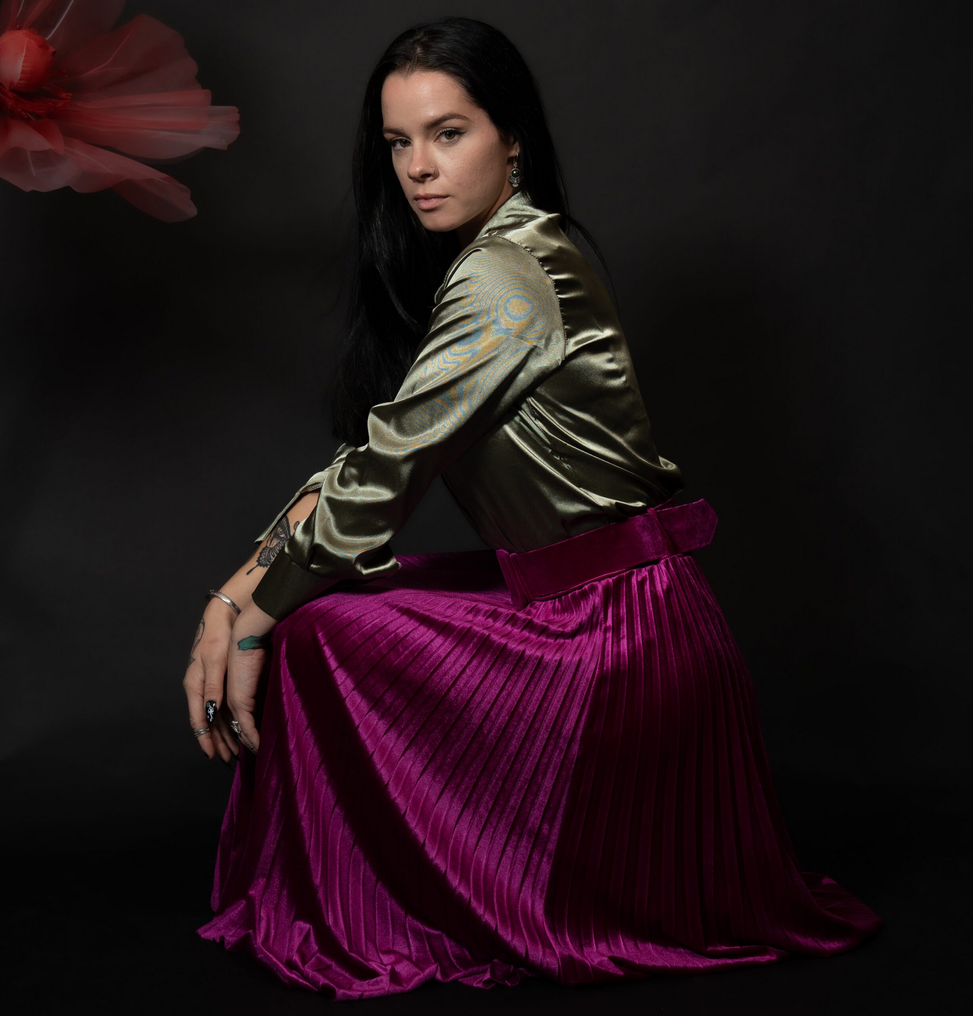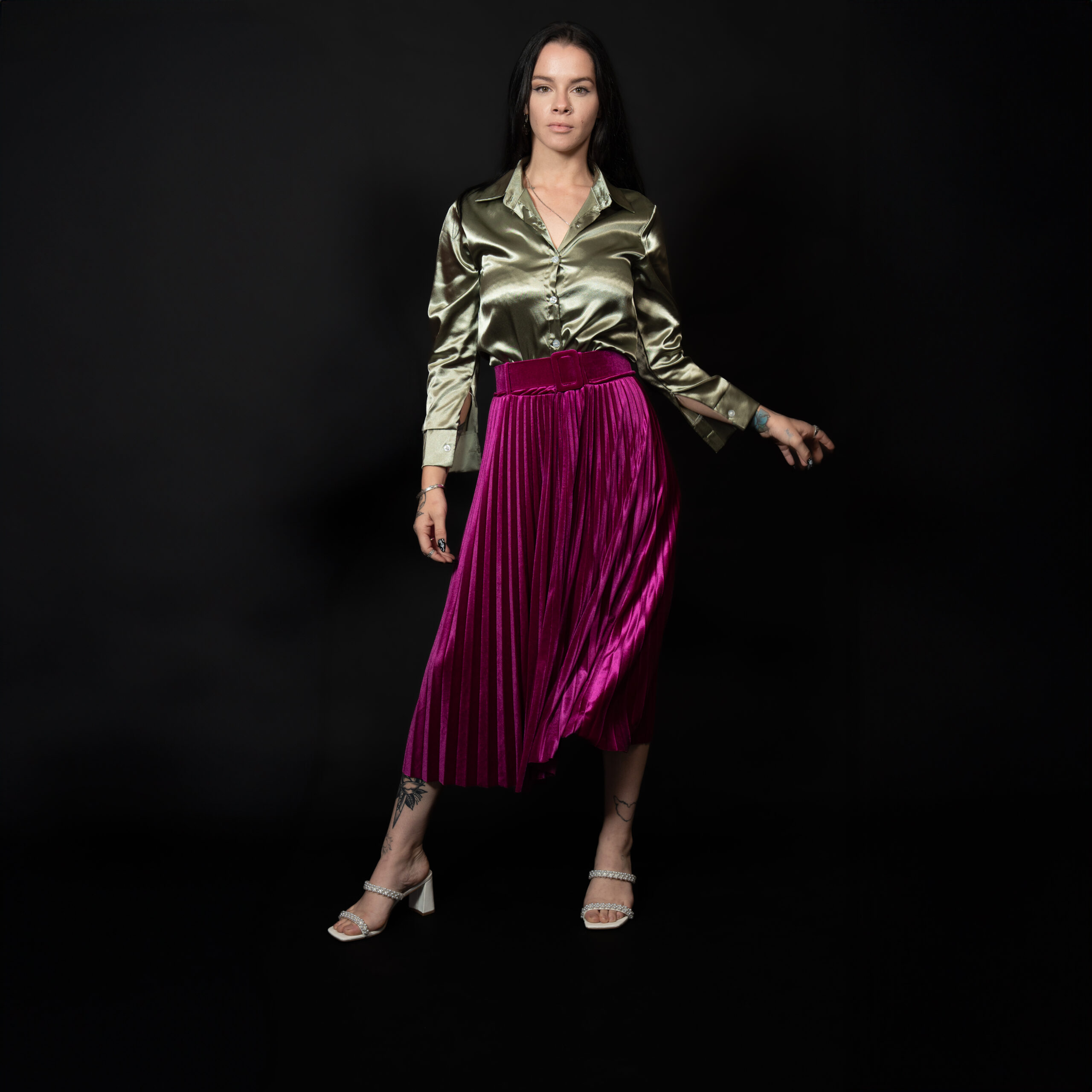 The Oura Velvet Skirt in Fuchsia is an elegant and luxurious addition to any wardrobe. Crafted from premium Italian silk velvet, this long pleated skirt exudes sophistication and grace. The solid fuchsia color adds a bold yet timeless appeal, while the matching wide belt cinches the waist to create a flattering silhouette. Perfect for formal events or upscale gatherings, the skirt is both versatile and stylish. Made from 95% polyester and 5% elastane, it offers a comfortable fit with a slight stretch, accommodating a range of sizes up to XL.