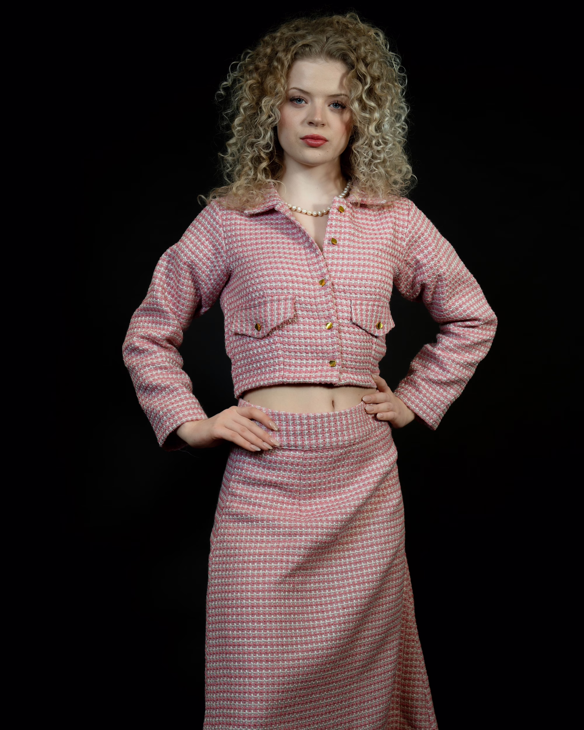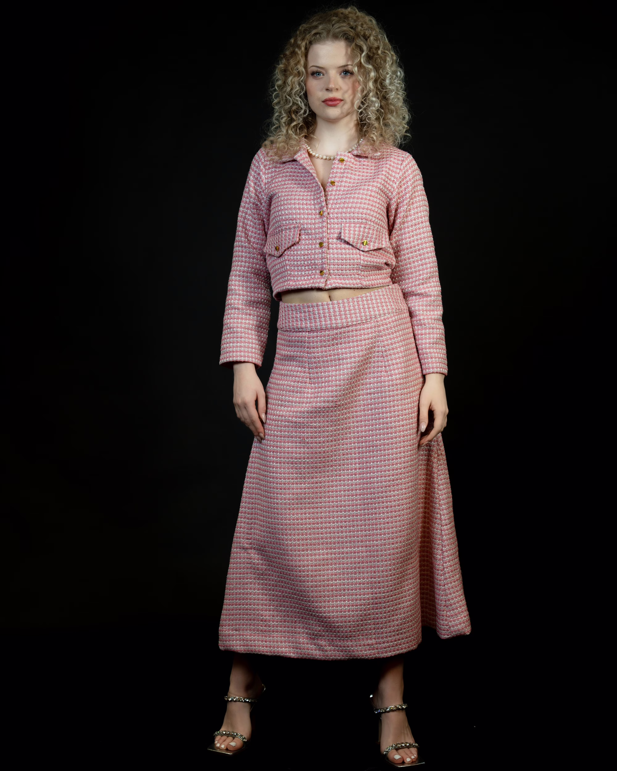 The Pink Tweed Tapestry is a statement skirt designed in rich, textured tweed. Its full-length A-line silhouette flows gracefully, offering a flattering fit for all body types. Finished with a fitted high waist and soft pink tone, this versatile piece pairs effortlessly with shirts or blouses for refined, timeless elegance — without needing a matching blazer.