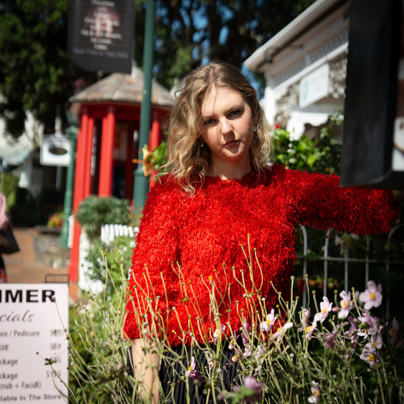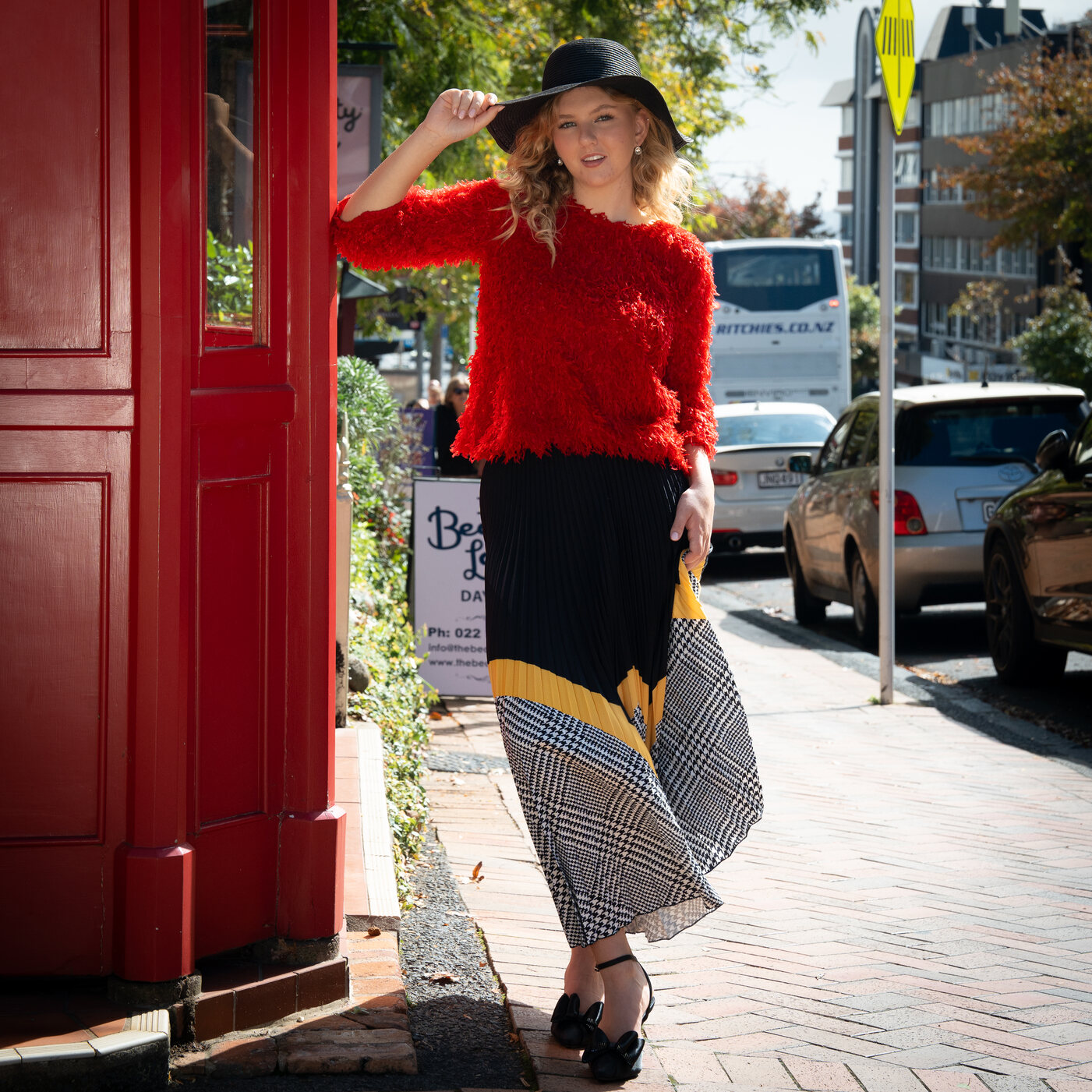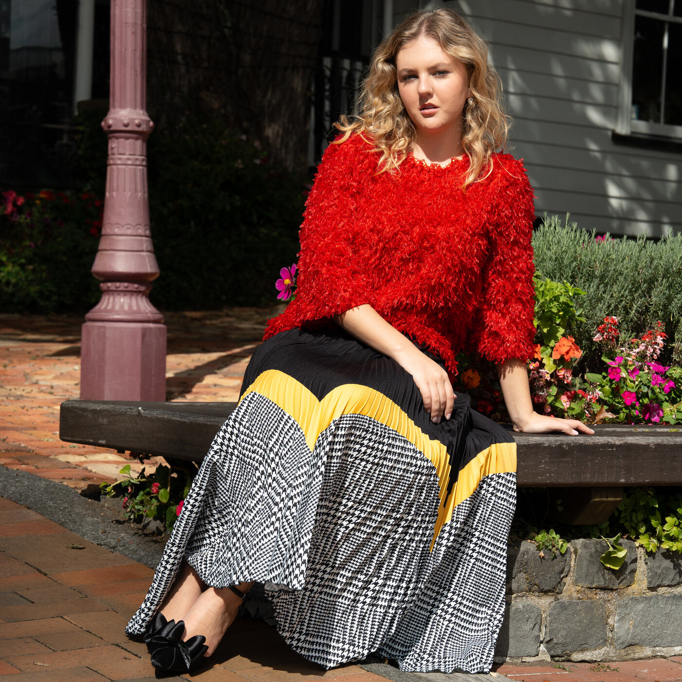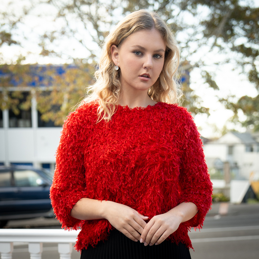 The Red Feather Sweater features 3/4 sleeves and a boat neck. It has faux feathers, giving it a chic and stylish appearance. This one-size sweater fits up to XL.