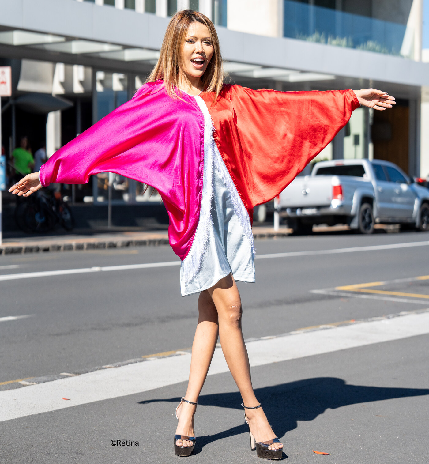 Elegant & Classic Red & Pink Dress crafted in Satin. The dress features tassel detailings, kimono-style sleeves, and a grey satin halter slip. An easy-to-wear piece that combines classic and contemporary styles.