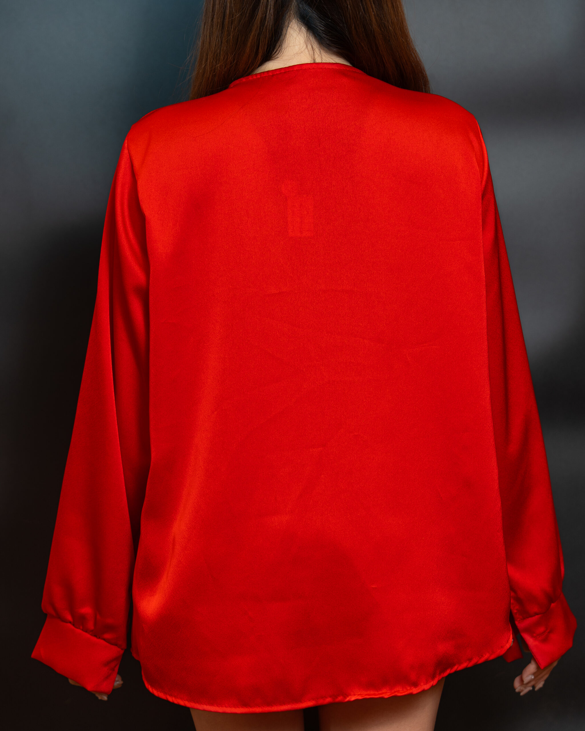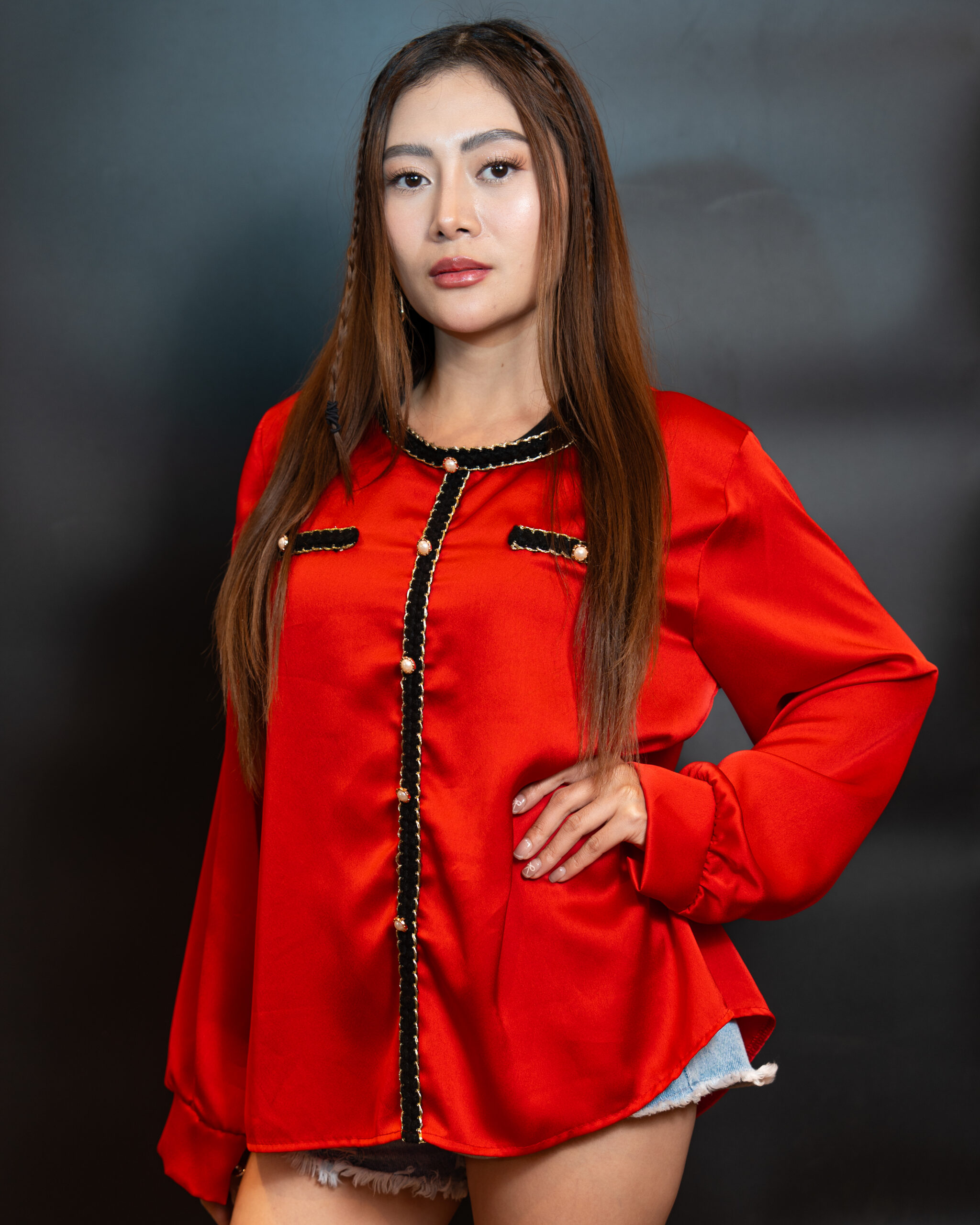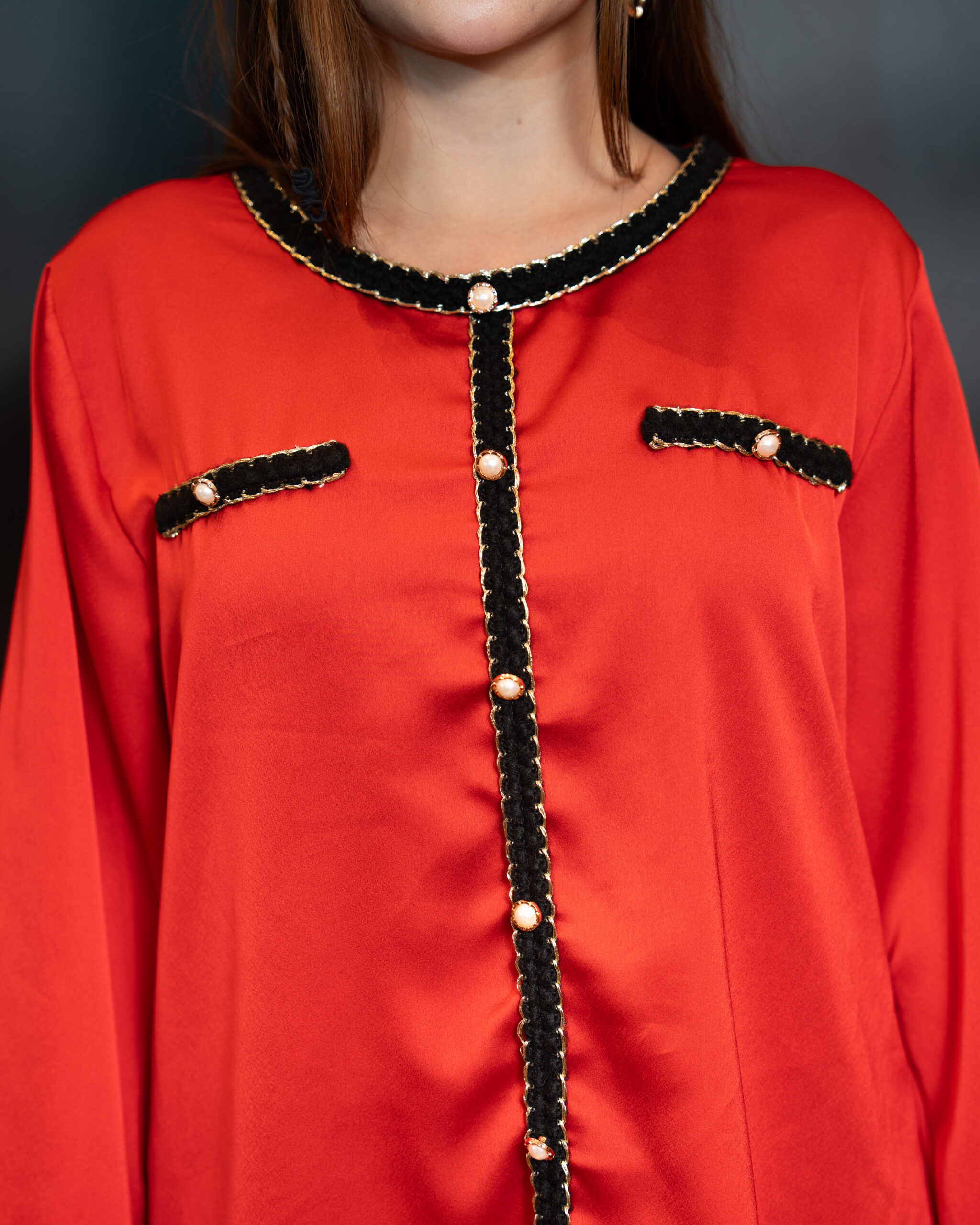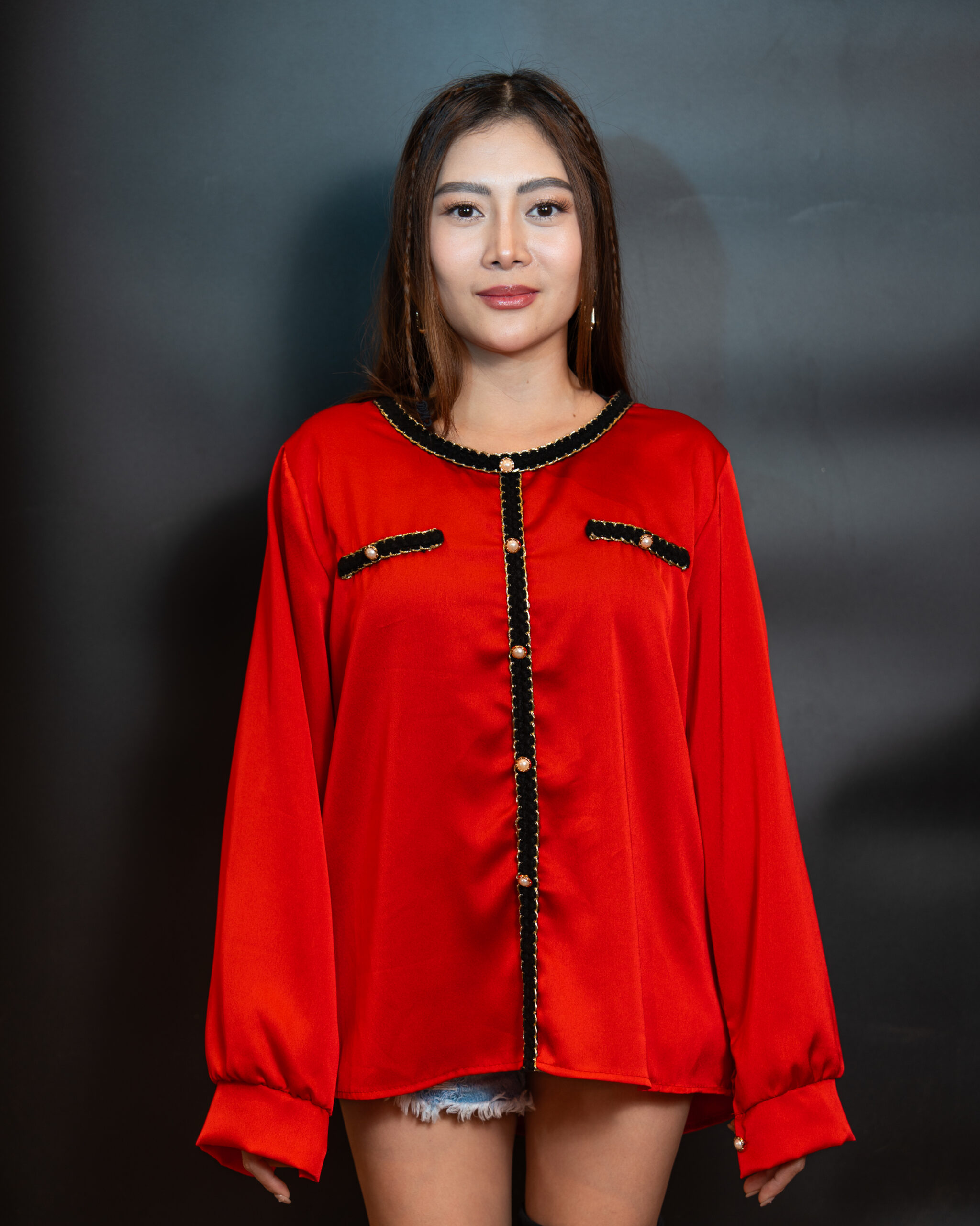 This elegant blouse features faux jewel buttons and a polished silhouette. Ideal for festive evenings and refined daywear.