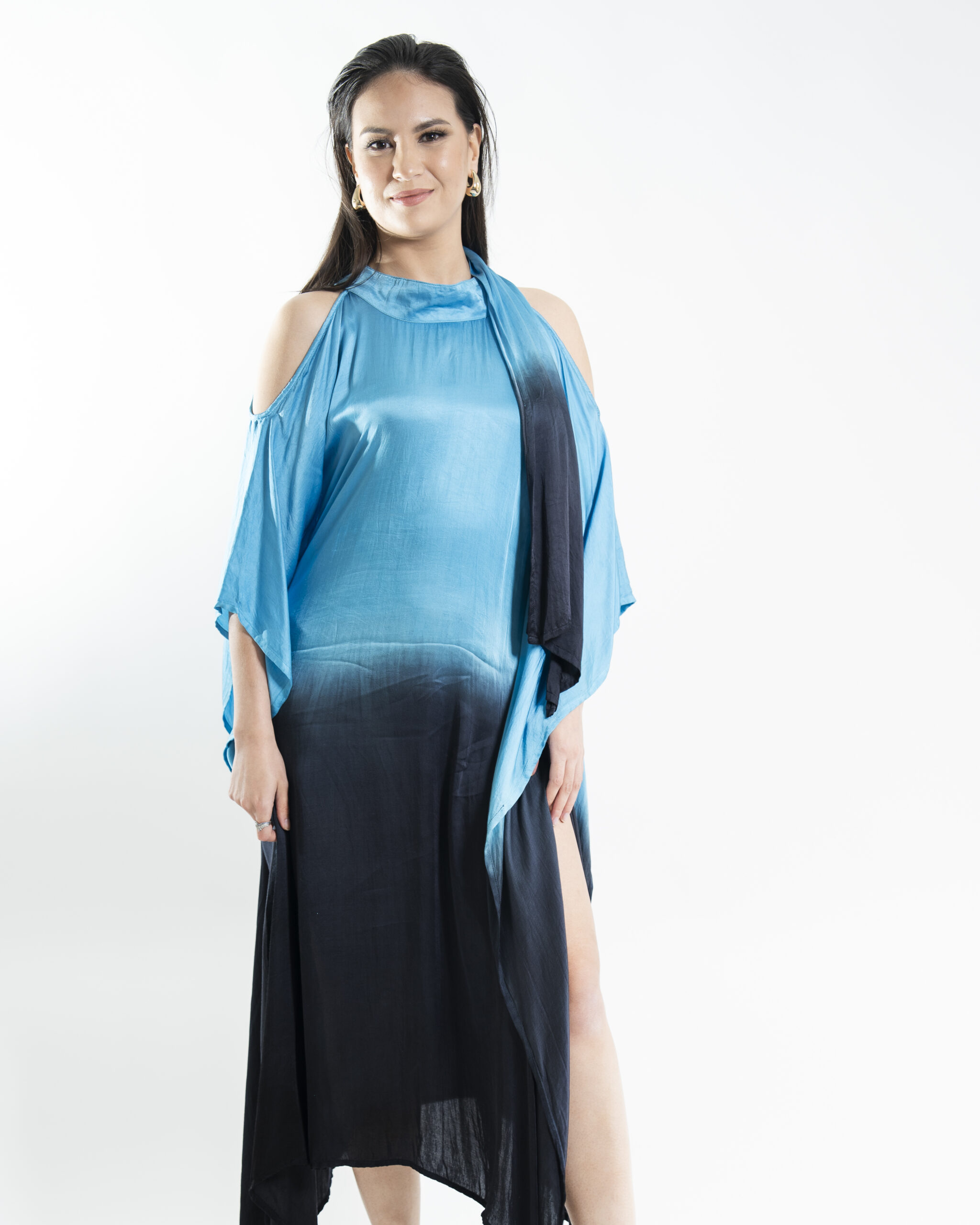 A stunning ombre kaftan in teal and black, crafted with traditional handblock printing techniques. Features kimono sleeves and a draping silhouette, making it ideal for holiday travels and classy occasions.