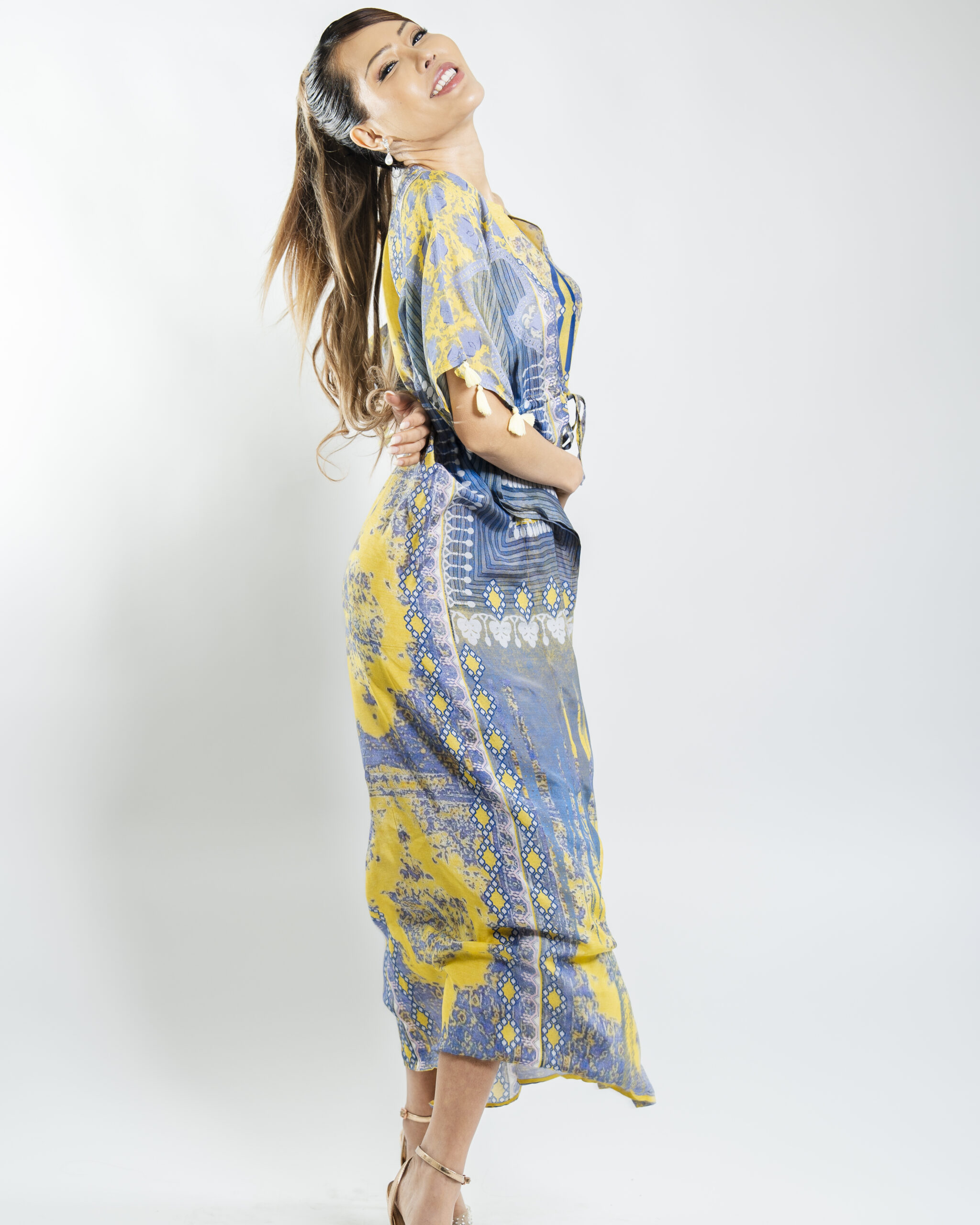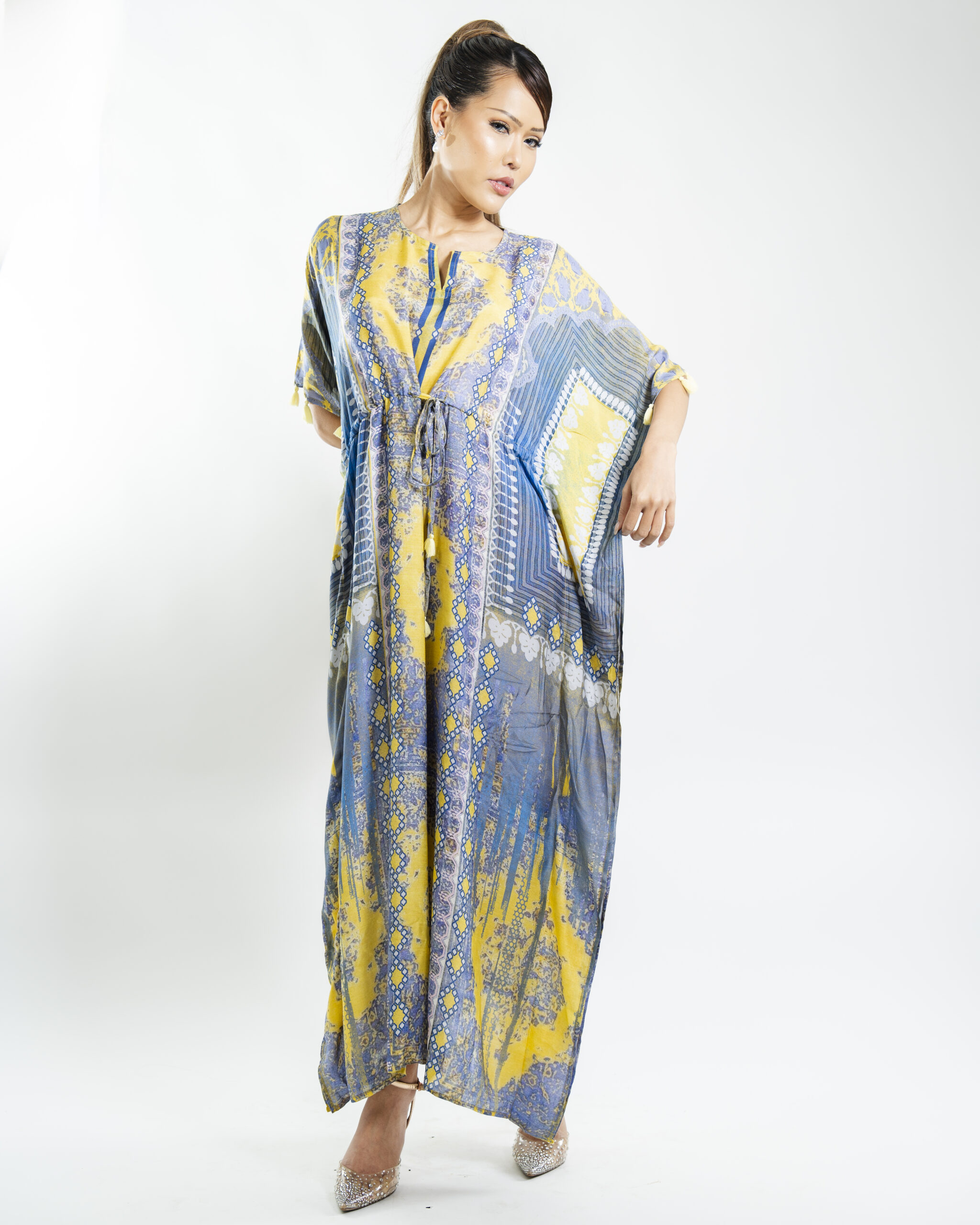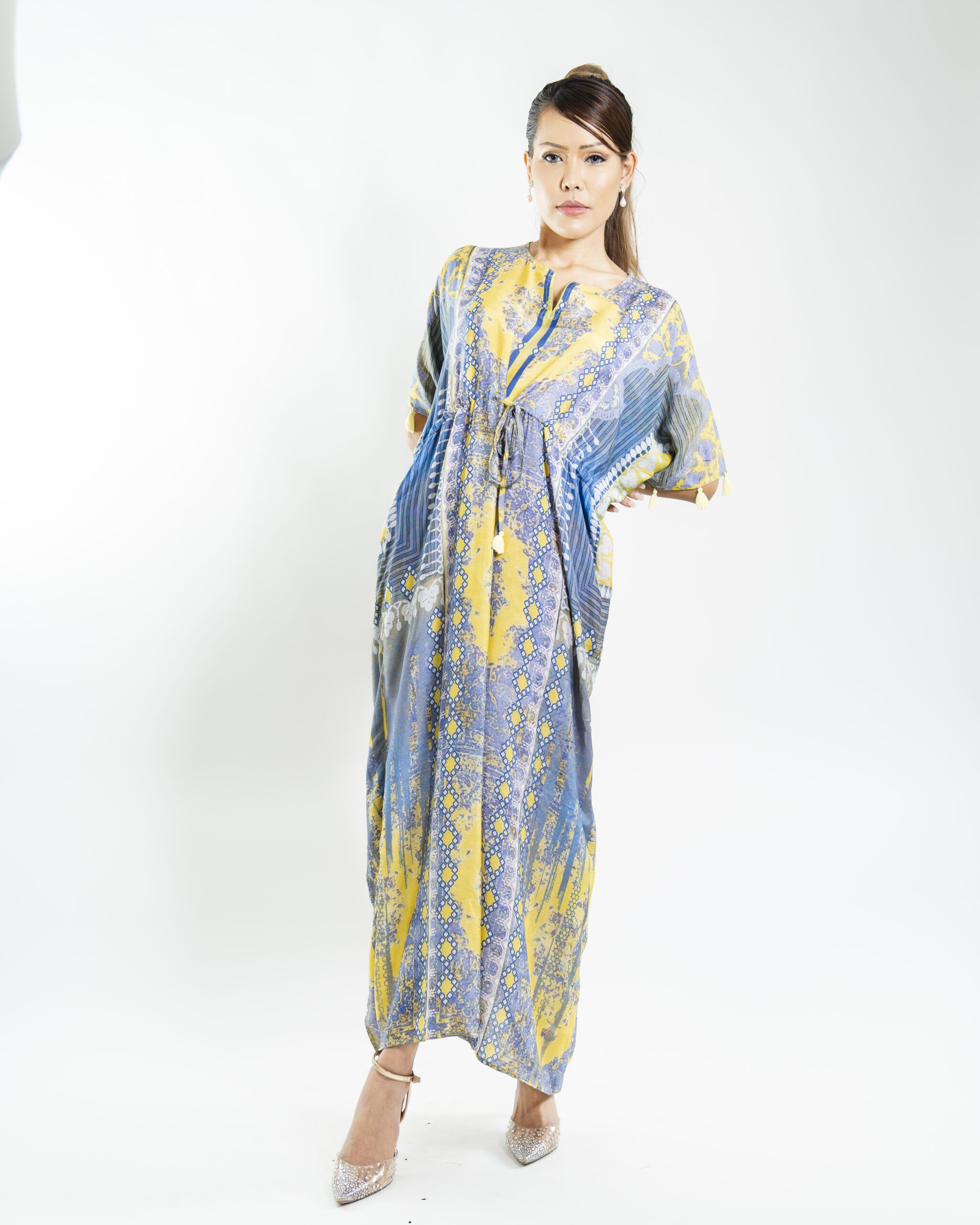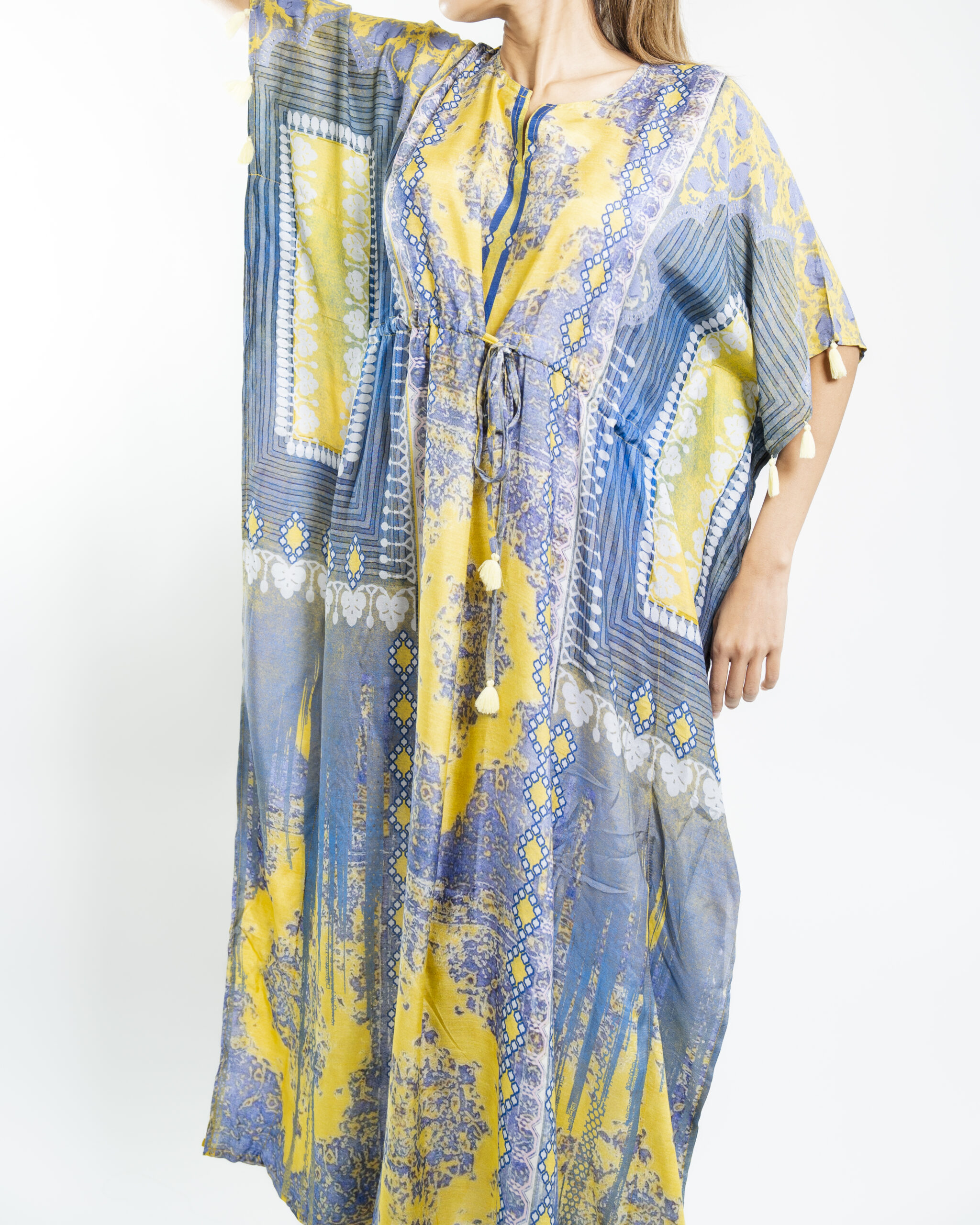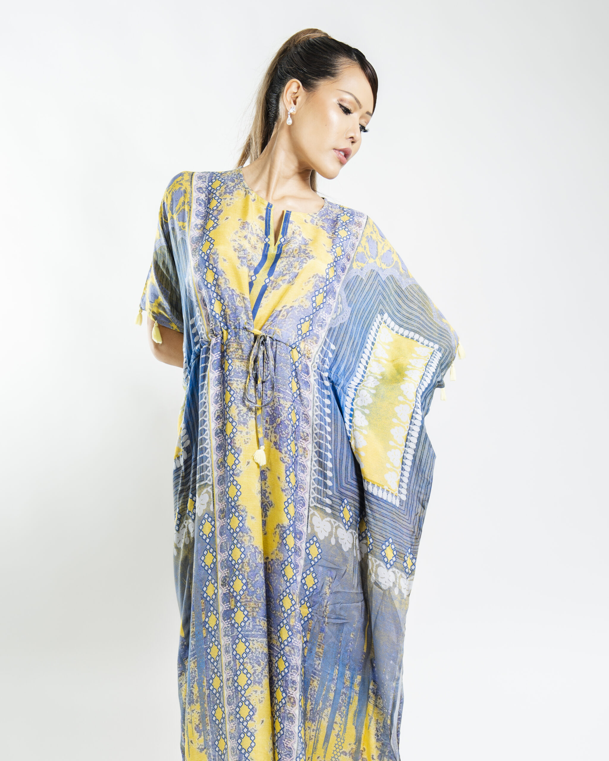 Experience the essence of spring with this luxurious resort kaftan featuring handcrafted tassels and a soft, flowing fabric in royal blossomy hues. Perfect for humid climates, its relaxed fit ensures comfort and style.